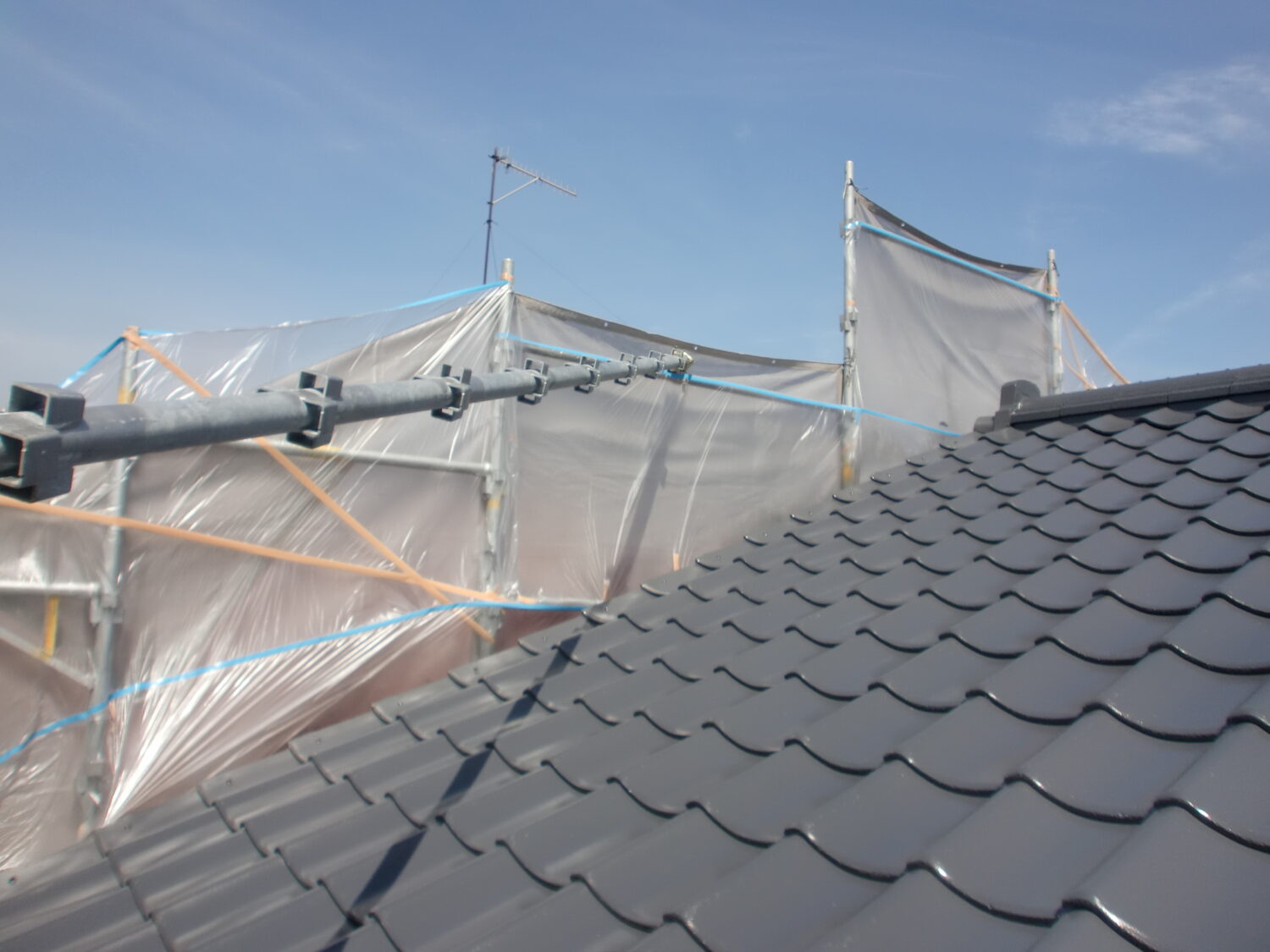 屋根塗装の際、近隣の方に塗料が飛散しないよう、メッシュの内側にも養生を行い、万全を期しています。