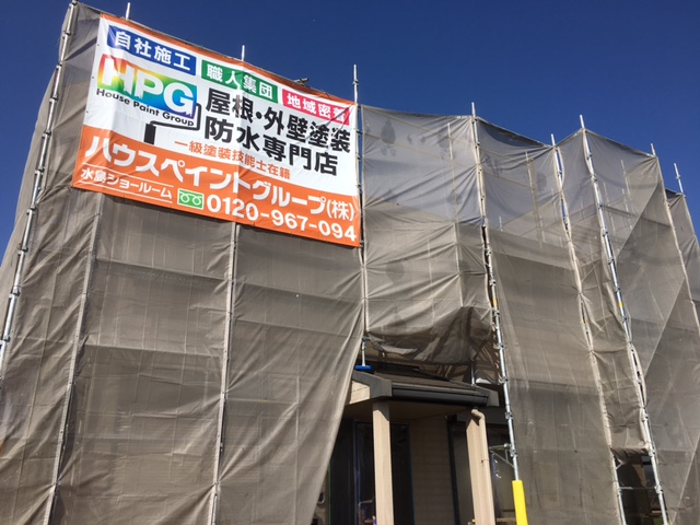 足場を組んで施工に入ると、ハウスペイントグループのイメージカラーであるオレンジが目を引く垂れ幕を設置させていただいております。
