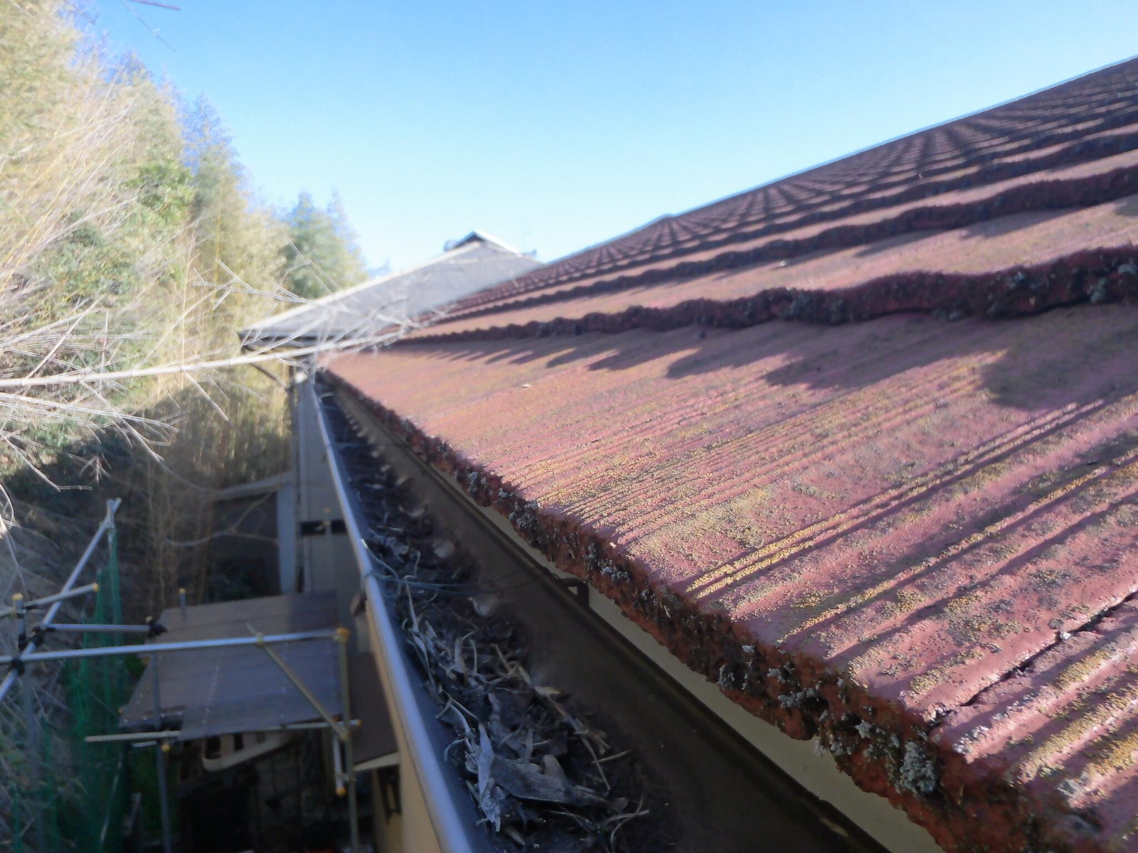 また、屋根の劣化が激しく、コケがたくさん付着している場合は、樋の中にもコケが堆積し草まで生えている事が。
