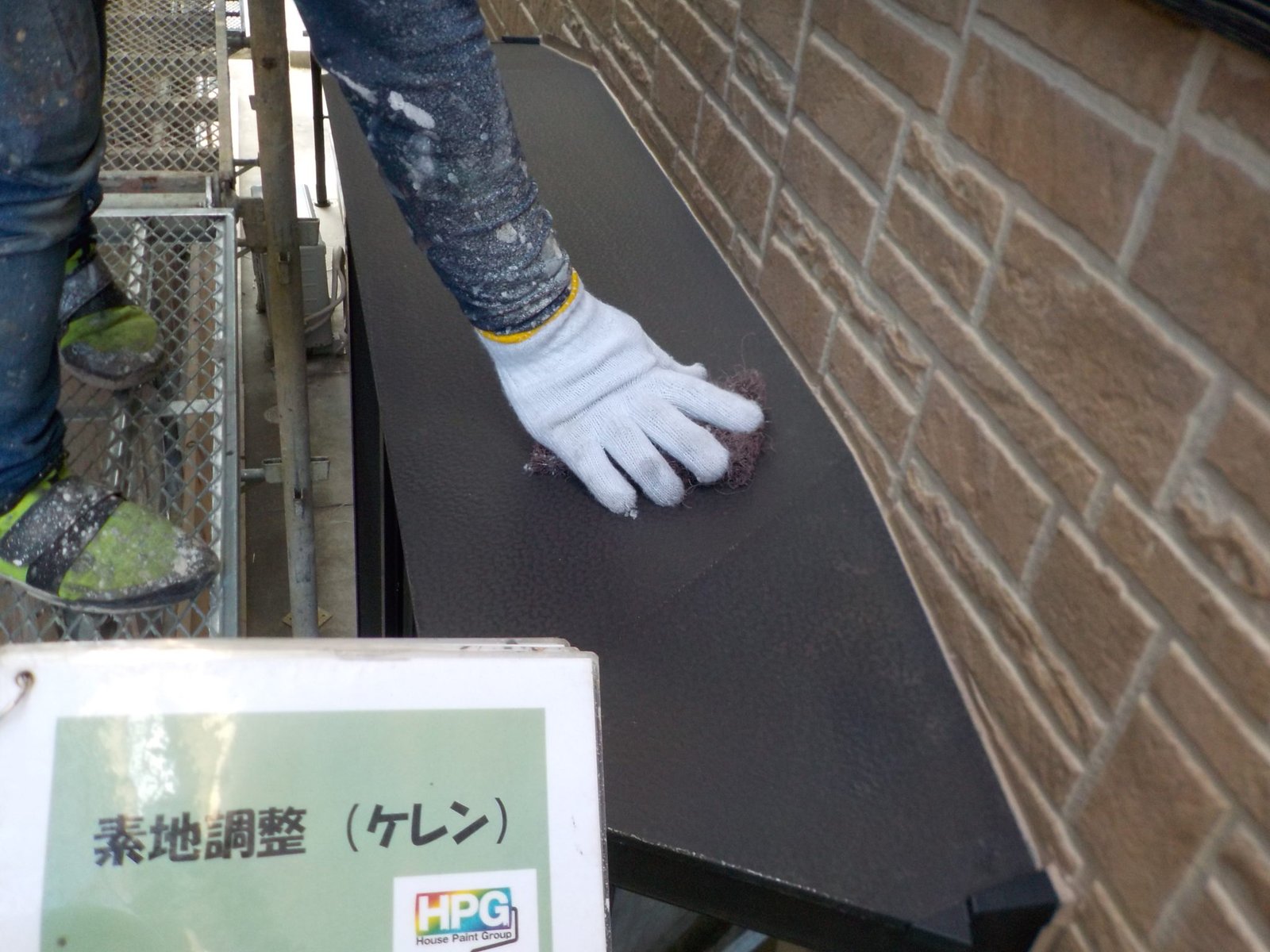 小庇上部などの鉄部を塗装する際は、手ケレンであえて目に見えないような小さな傷を付けることで