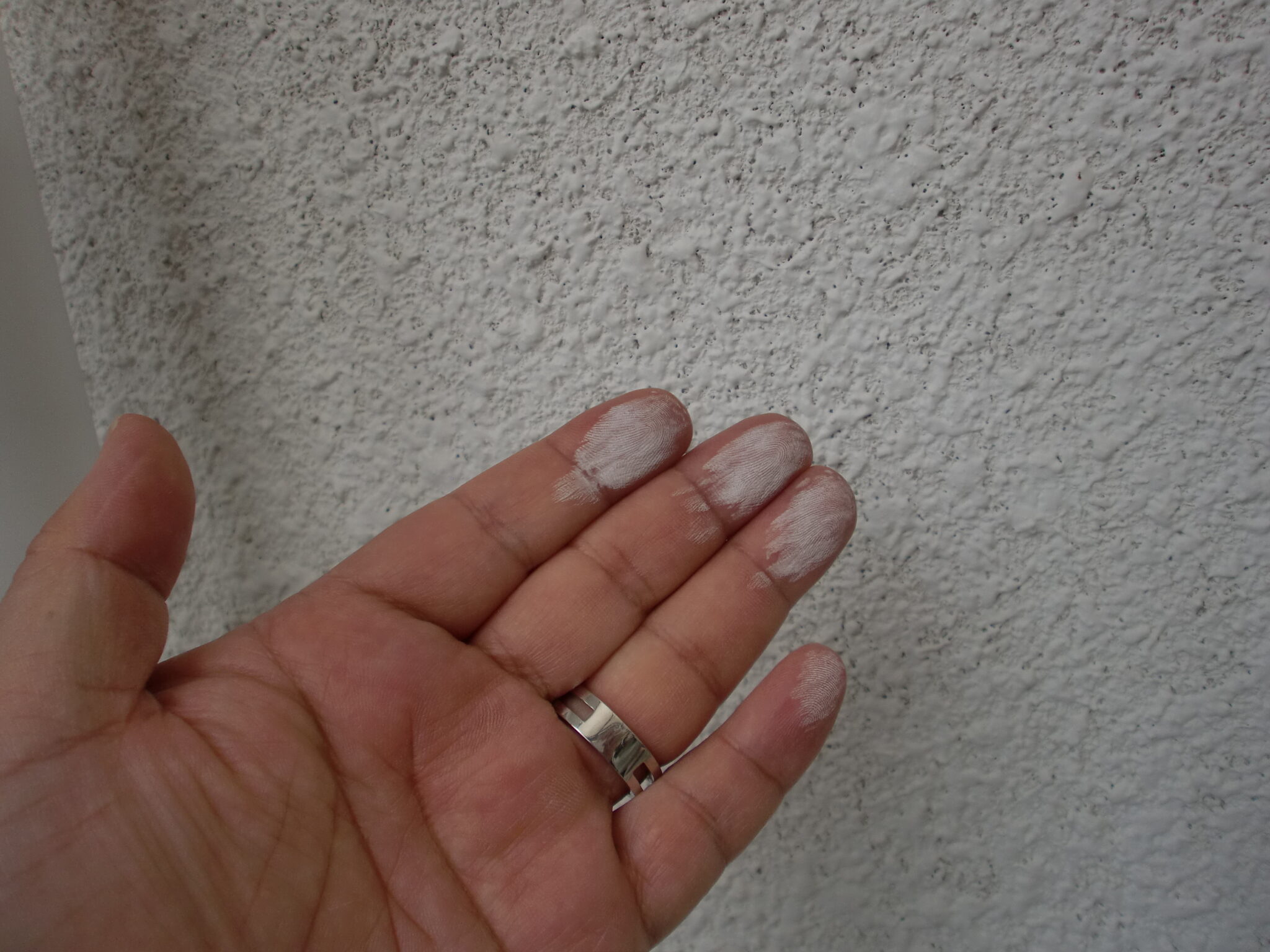 現地調査では外壁のチョーキング(塗膜が劣化して外壁と触ると手に白粉状の塗膜が付着する現象)が
