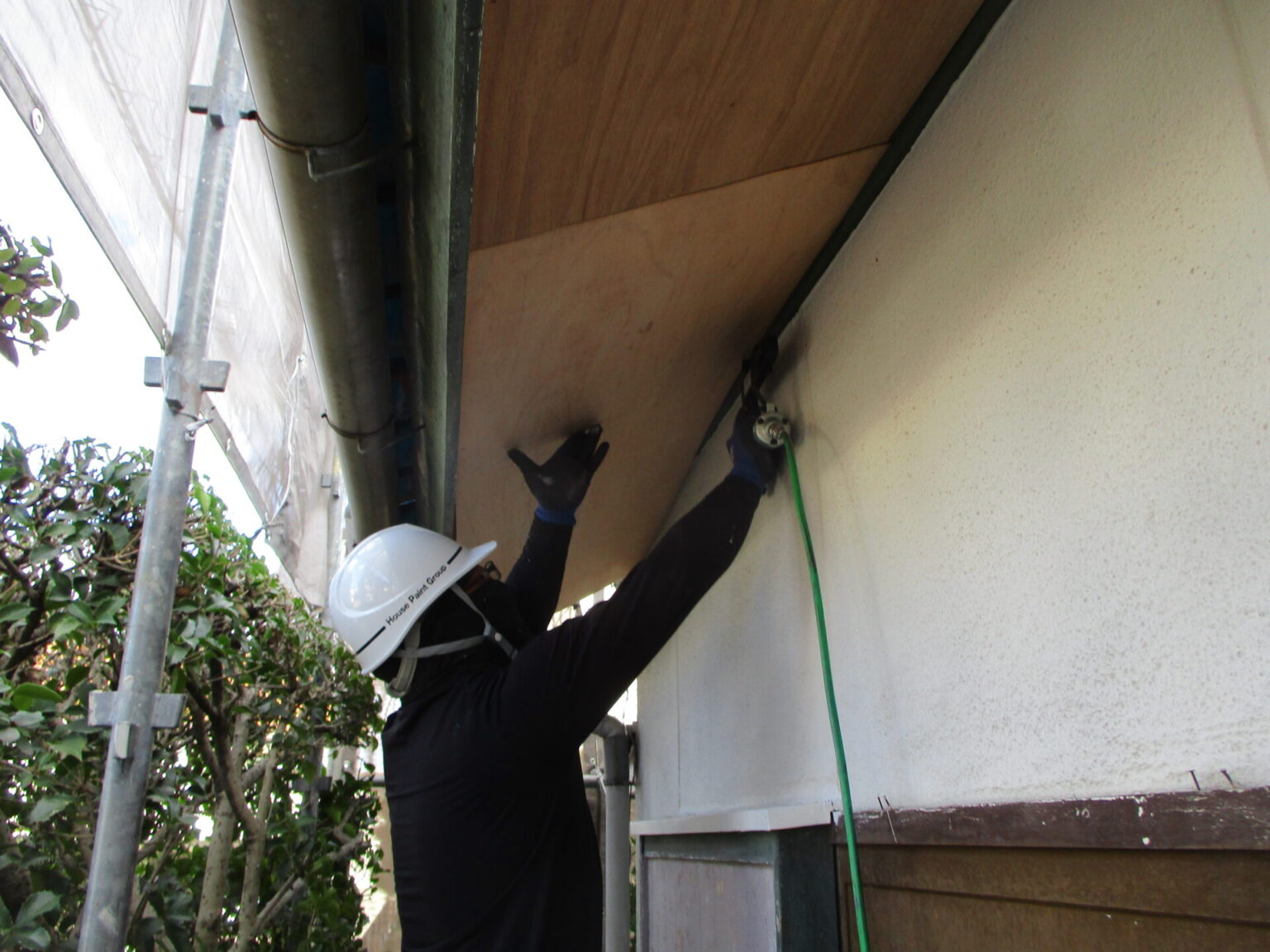 例えば軒裏のケイカル板の腐食や、樋が割れている場所は塗装前に交換します。