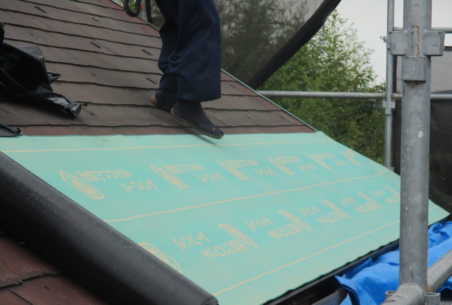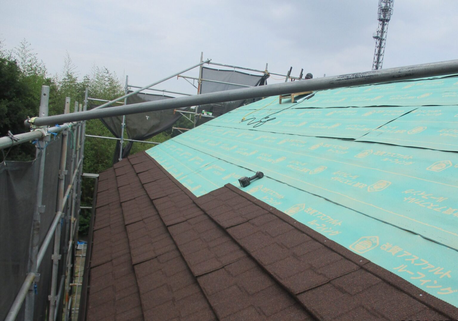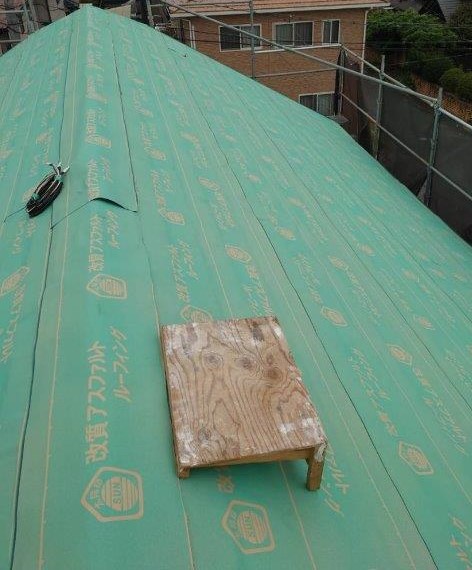 ルーフィングといわれる防水シートを軒先から棟にめがけて敷き詰めます