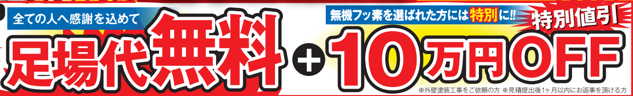 足場代無料+10万円OFF(無機フッソ塗料を選ばれた方)の豪華特典を皆様にプレゼント!