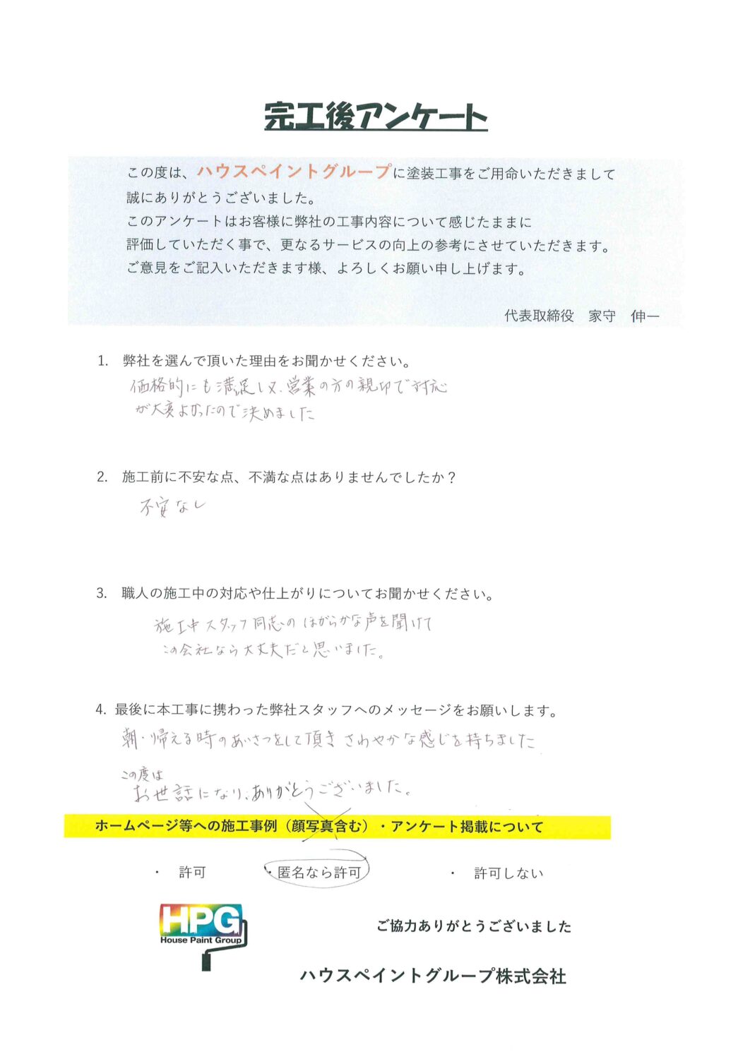 Q: 弊社をお選び頂いた理由は? A: 価格的にも満足し又、営業の方の親切な対応が大変良かったので決めました。 Q: 施工前に不安な点や不満な点は? A: 不安なし Q: 施工中の職人の対応や仕上がりについては? A: 施行中スタッフ同士のほがらかな声を聞けてこの会社なら大丈夫だと思いました。 Q: 最後に弊社スタッフヘメッセージをお願いします A: 朝・帰るときの挨拶をして頂き爽やかな感じを持ちました。 A: この度はお世話になりありがとうございました。
