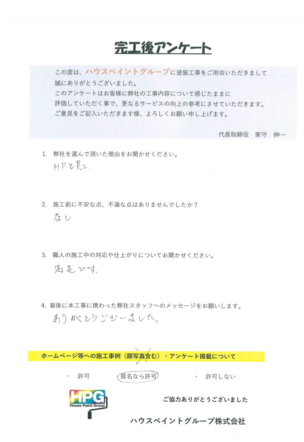 Q: 弊社をお選び頂いた理由は? A: HPを見て Q: 施行前に不安な点や不満な点は? A: なし Q: 施行中の職人に対応や仕上がりについては? A: 満足です Q: 最後に弊社スタッフへメッセージをお願いします A: ありがとうございました
