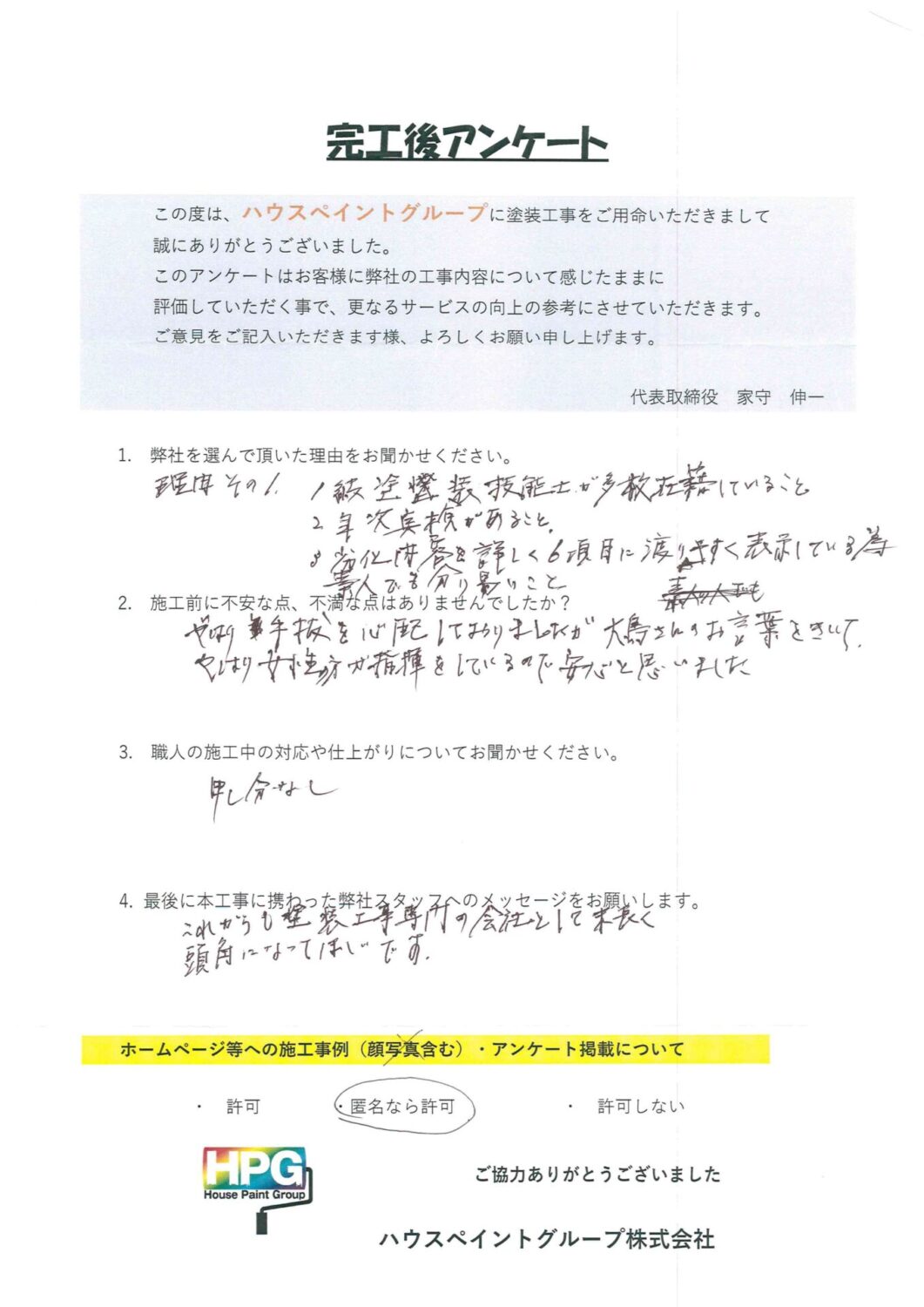 Q: 弊社をお選び頂いた理由は? A: 1 1級塗装技能士が多数在籍していること A: 2 年次点検があること A: 3 劣化内容を詳しく6項目にわたり表示している為、素人でも分かりやすい事 Q: 施工前に不安な点や不満な点は? A: やはり手抜きを心配しておりましたが、大島さんのお言葉を聞いて A: 女性の方が指揮をしているので安心だと思いました Q: 施工中の職人の対応や仕上がりについては? A: 申し分なし Q: 最後に弊社スタッフへメッセージをお願いします A: これからも塗装工事専門の会社として末永く頭角になってほしいです