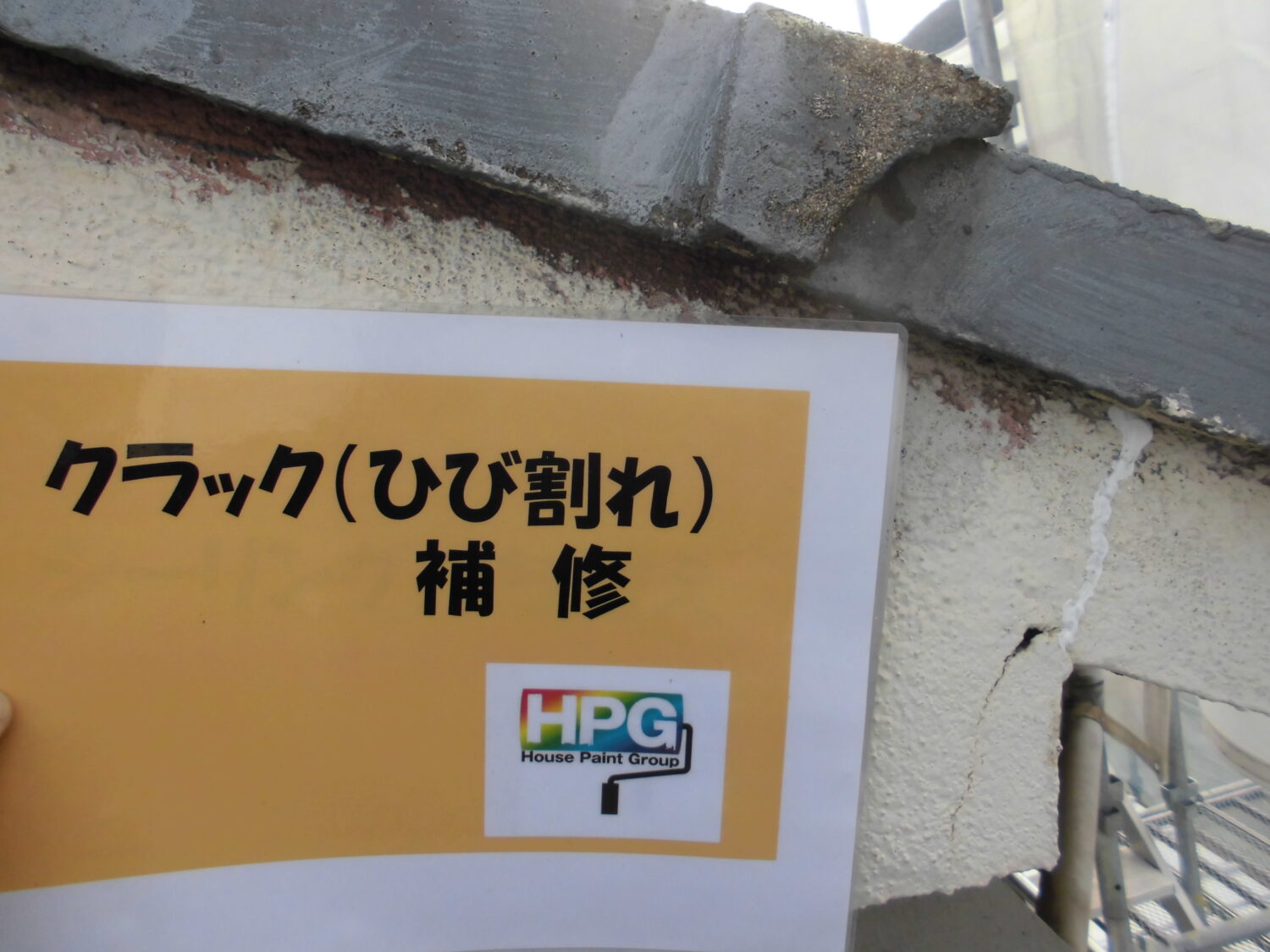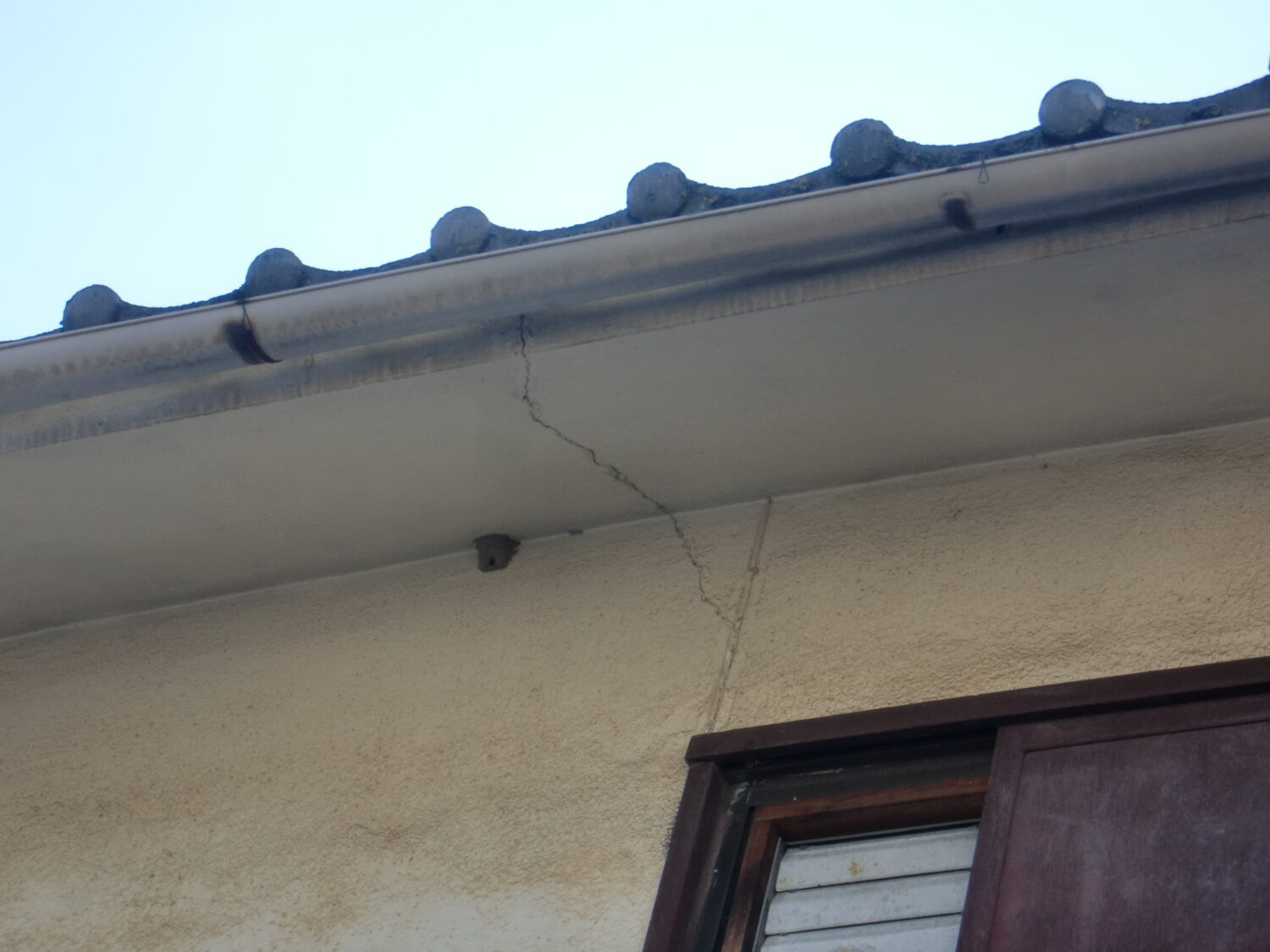屋根の色褪せや劣化に加えて コケの付着もみられます 軒裏から外壁にかけてひびが! 他にも数か所ひびを確認しています 塗膜の剥がれが深刻です……