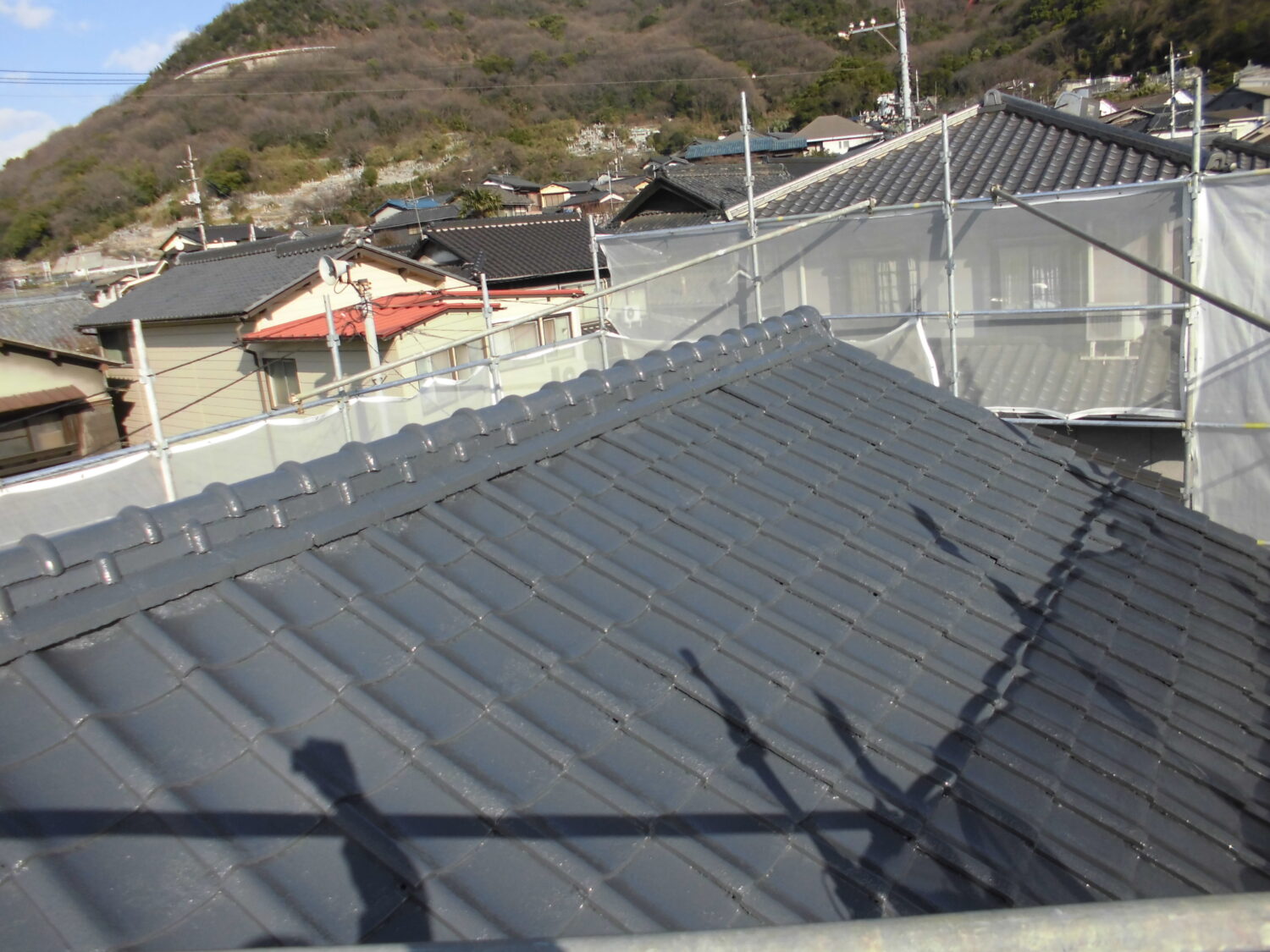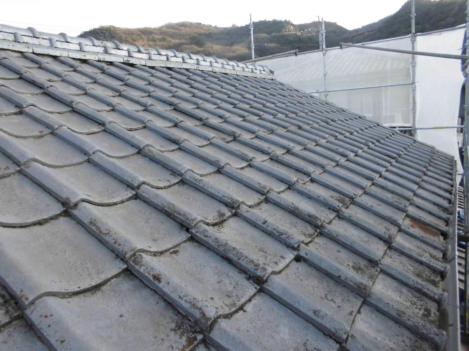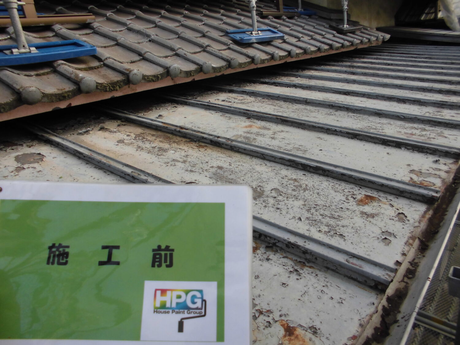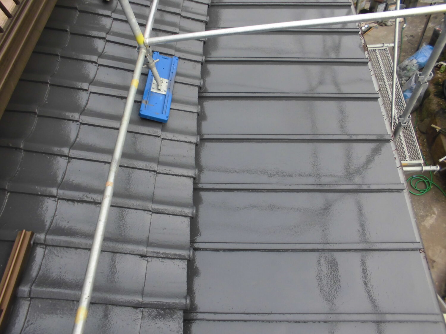 【屋根施工前】 【屋根施工後】 屋根にかなり色褪せや塗膜剥がれ コケの堆積が見受けられます まずは高圧洗浄で表面の汚れを 落としていきましょう ところどころひび割れがありました 雨水が入ってこないよう隙間を塞ぎます 塗料の密着性を高める為の 下塗りは大事です 中塗りでルーフマイルドSiを塗り 色をつけつつ表面を保護します 更に塗り重ねて対候性と光沢性をアップ