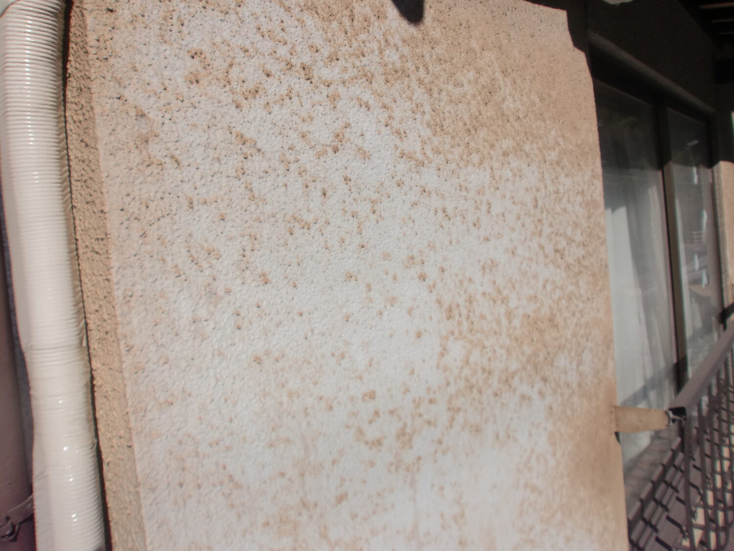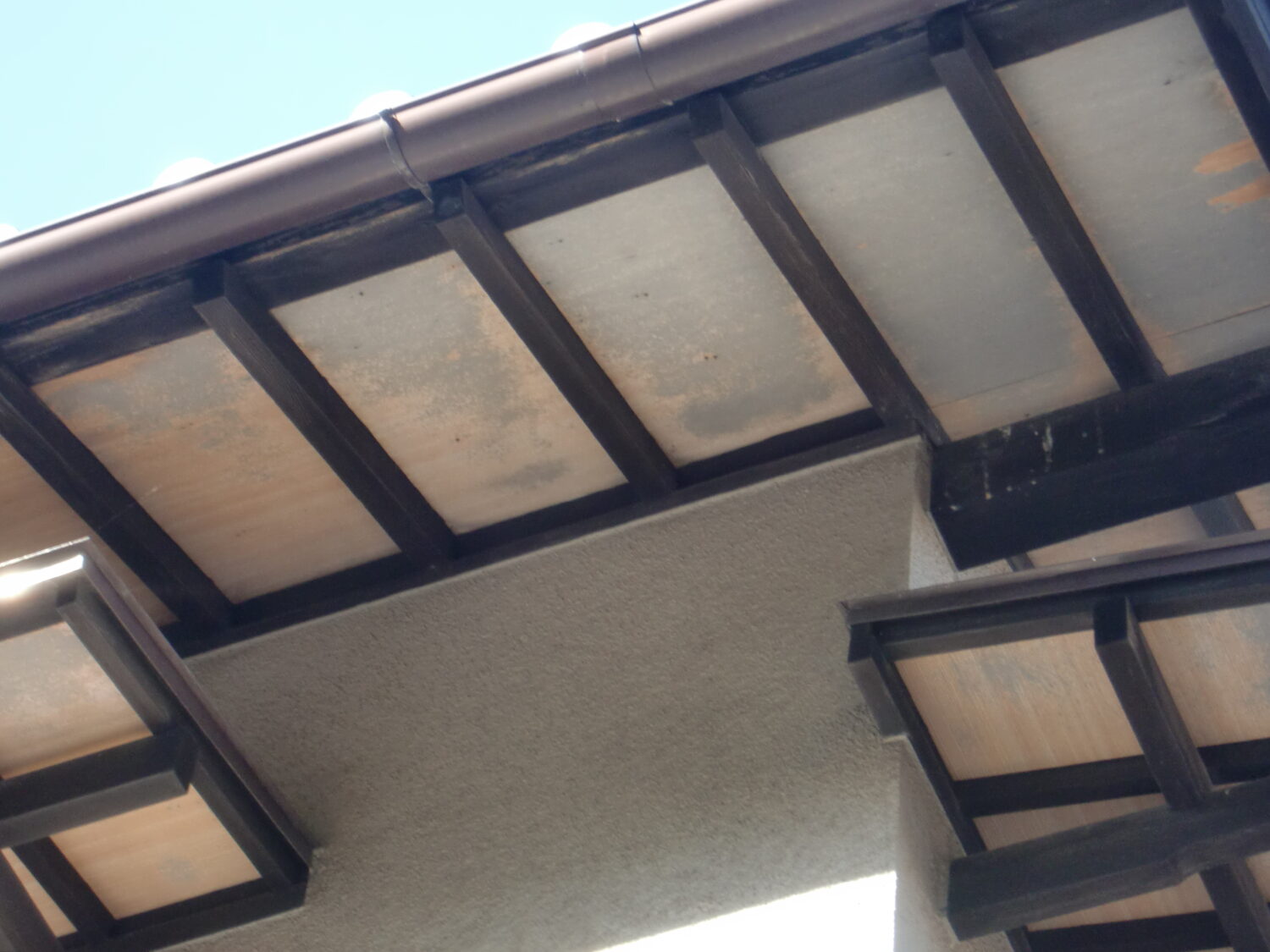 屋根にコケの塊が付着しており 雨水の跡も気になりますね 広範囲にわたる外壁の汚れが! 雨水の溜まりやすい軒天も 色褪せています……