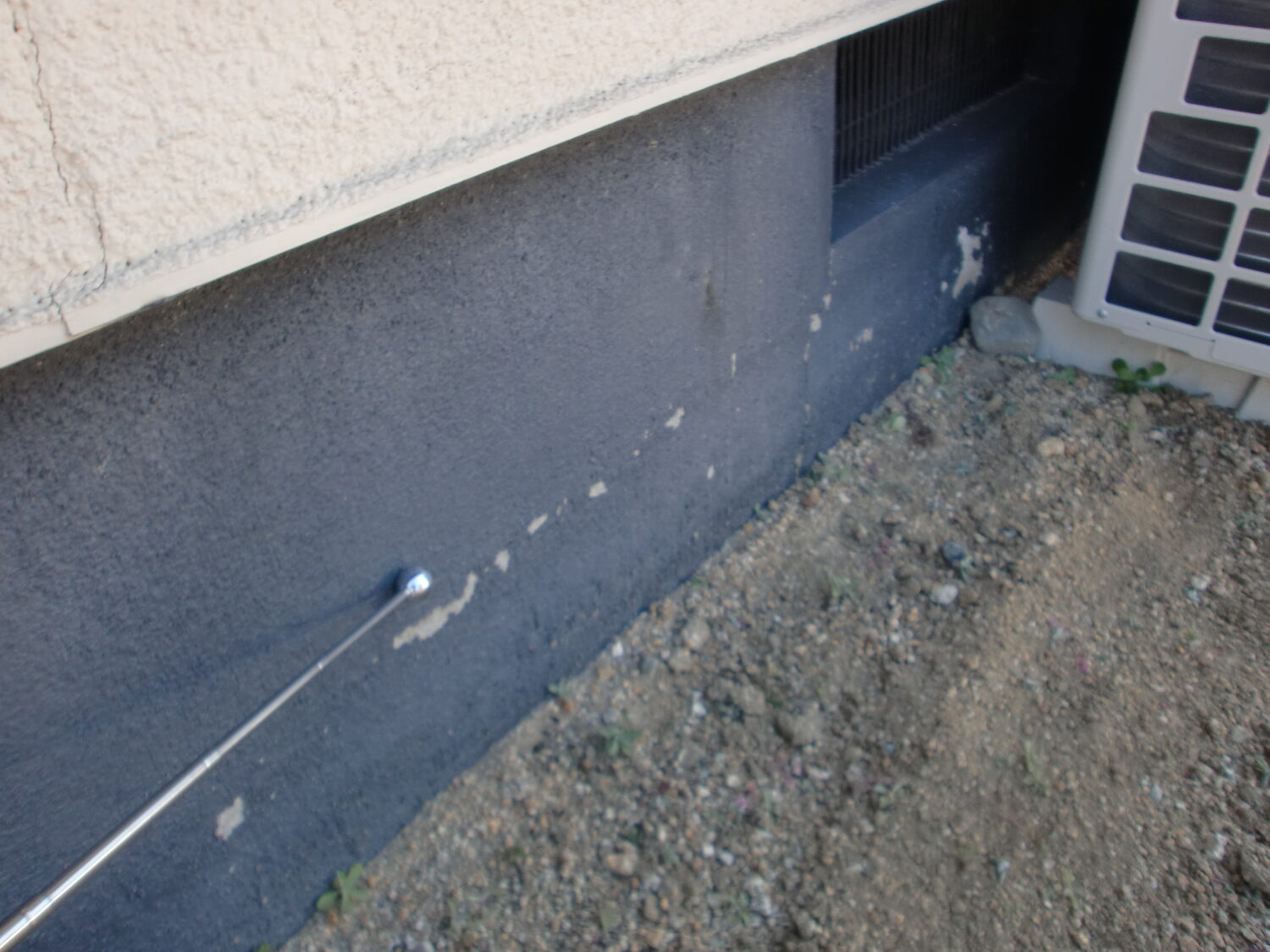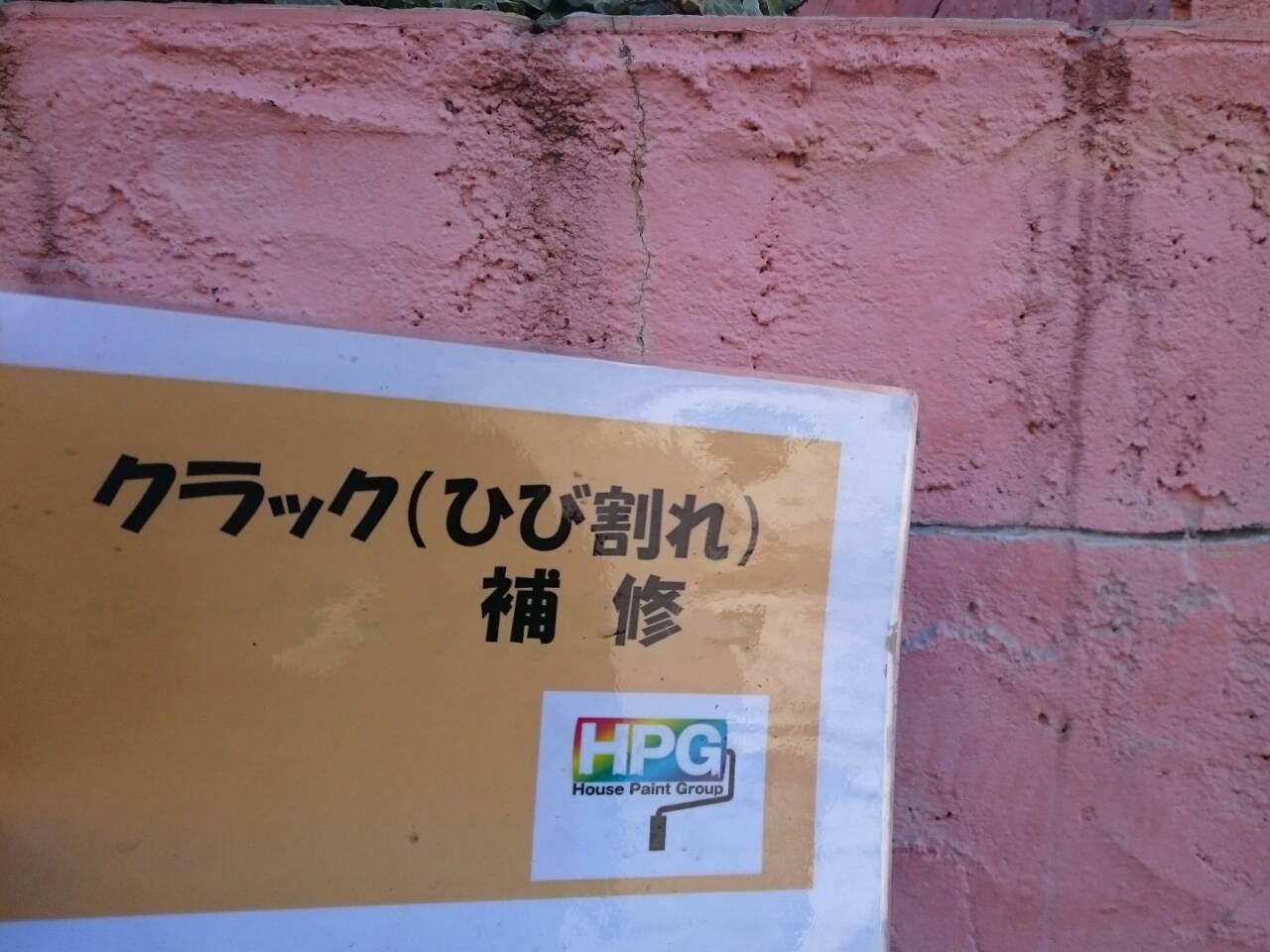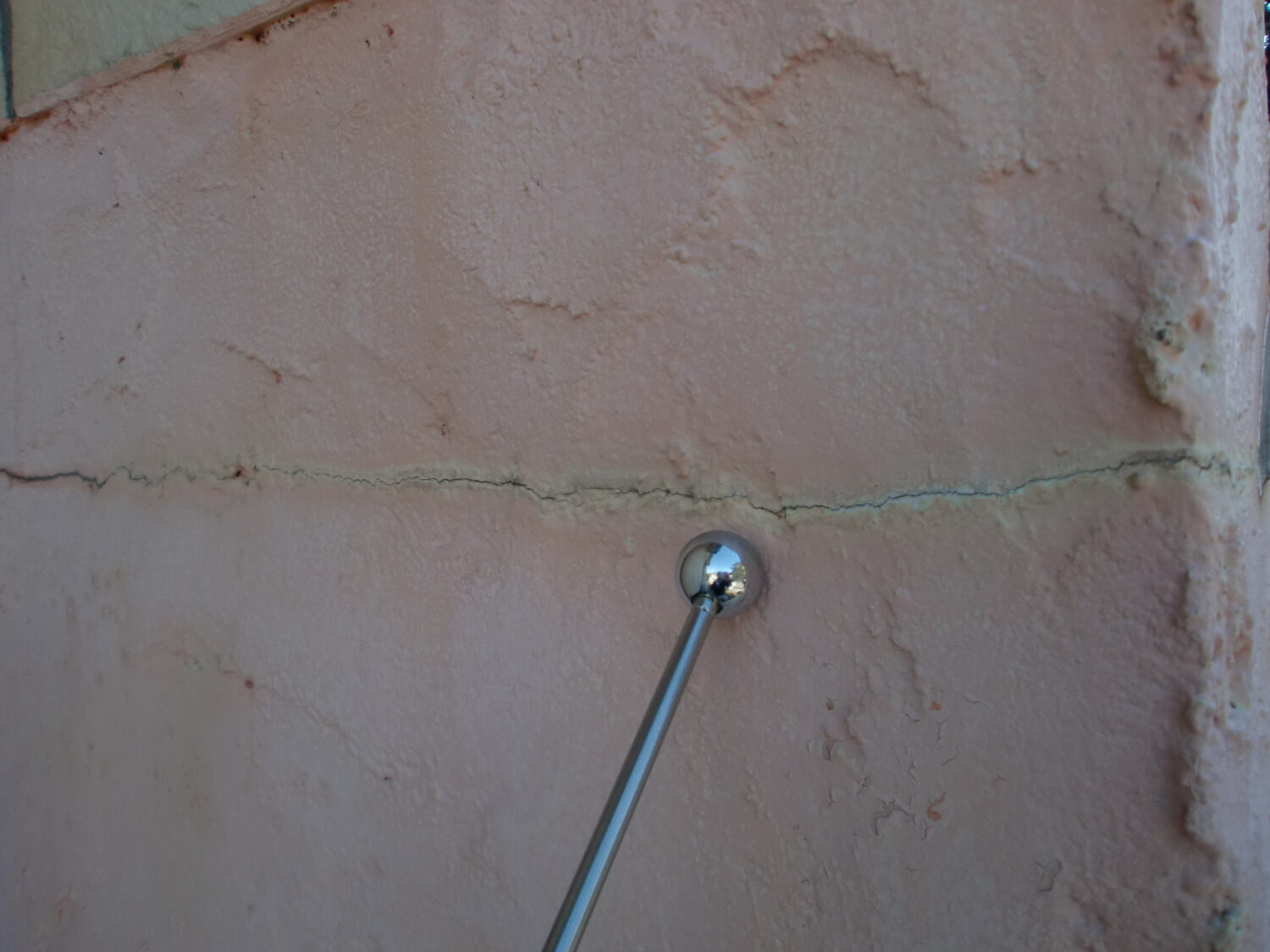 屋根表面が色褪せており 広範囲にコケも付着しているようです 基礎の塗膜剥がれが目立ちますね 塀に真一文字のひび割れが……