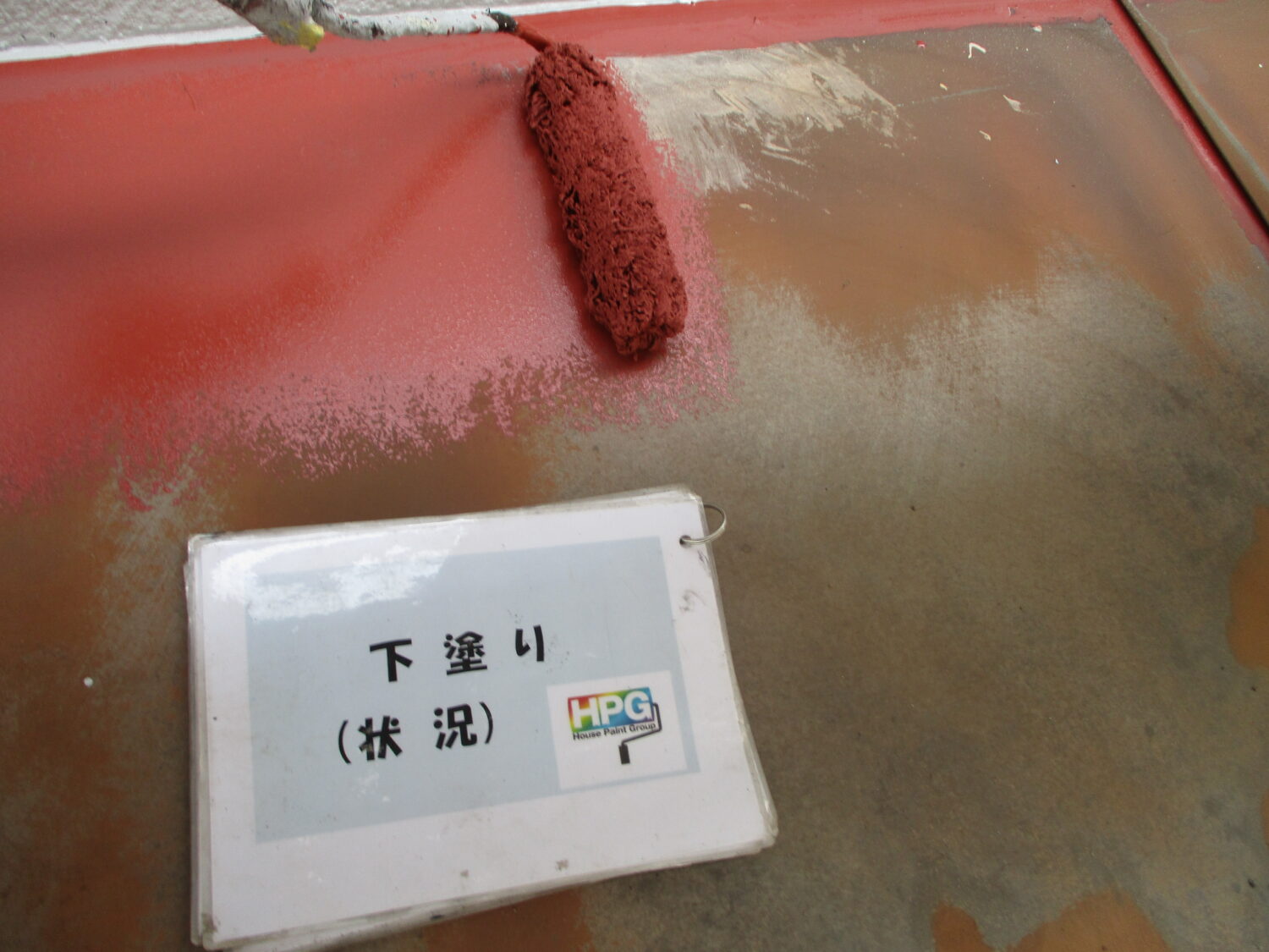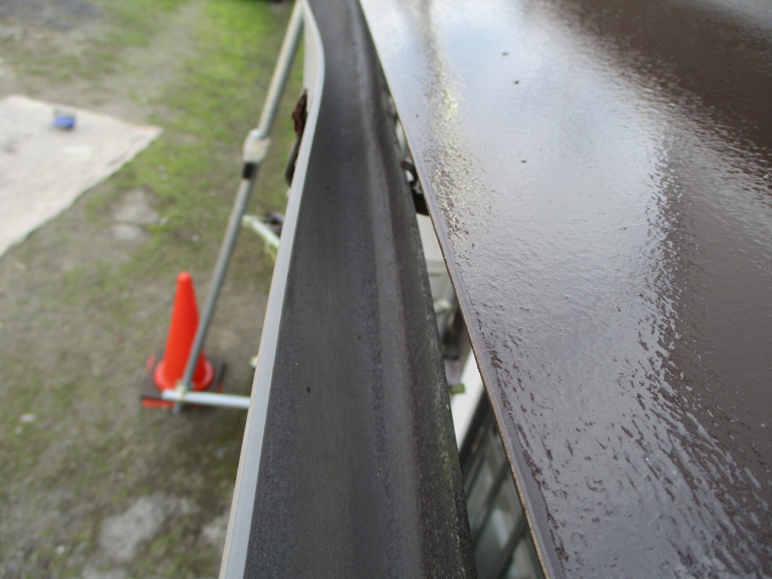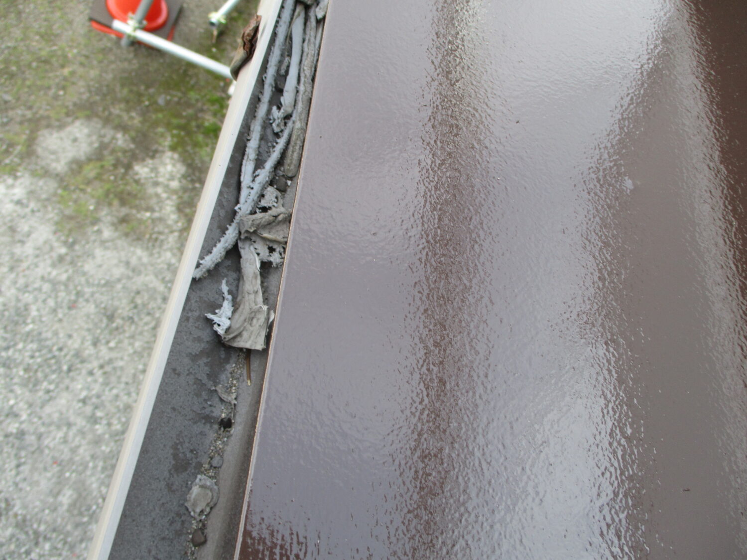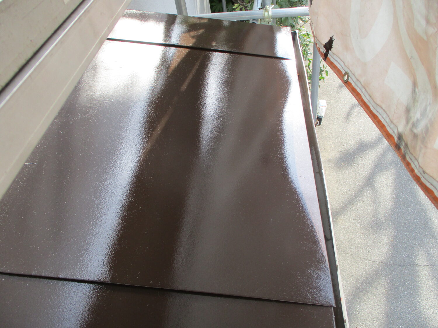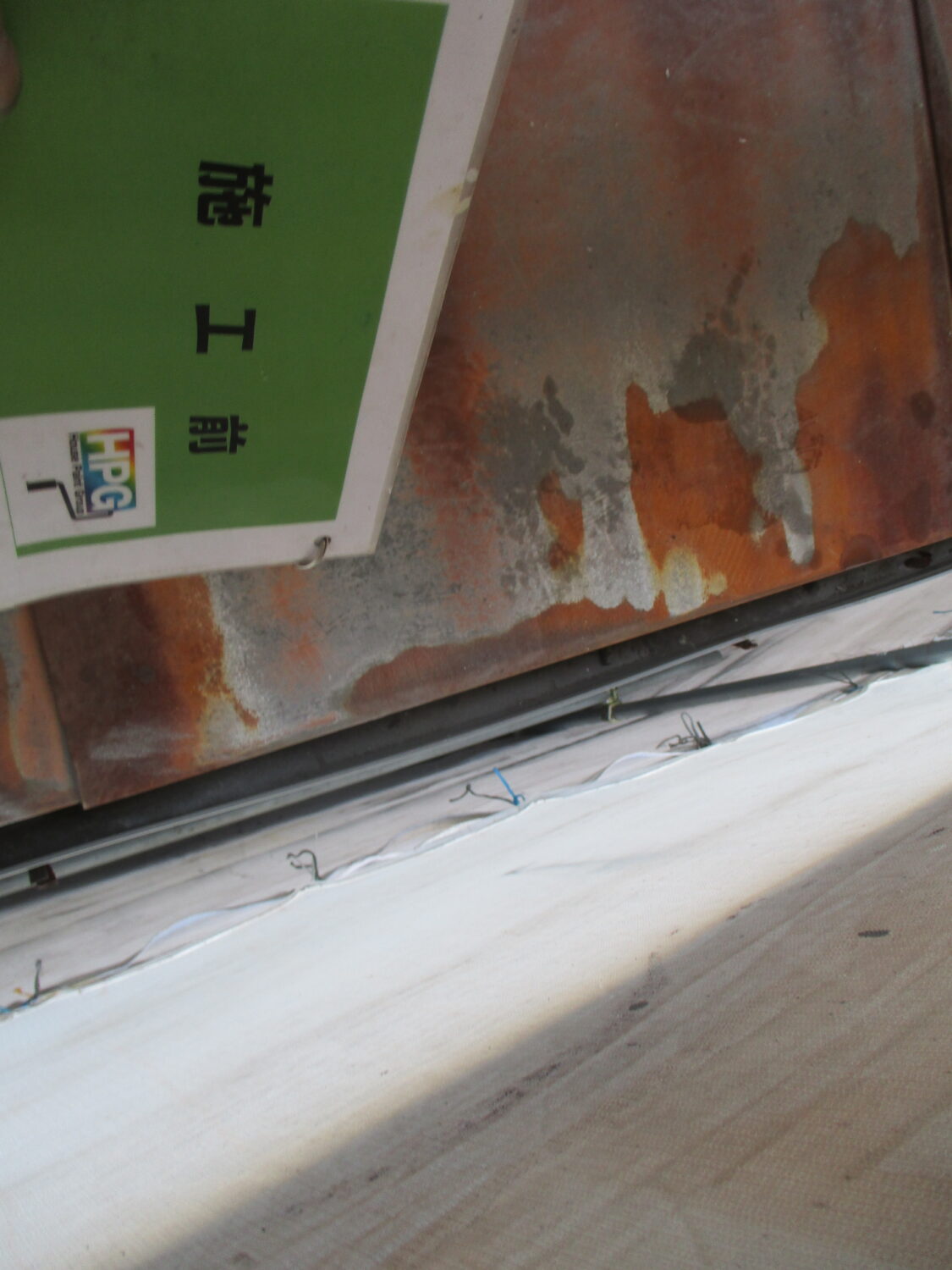 小庇鉄部 施工前:さびが出ていますね 素地調整後、錆止めです 中塗り→上塗りで綺麗になりました 樋清掃 ゴミが溜まっていますね 全て取り除き 綺麗になりましたね