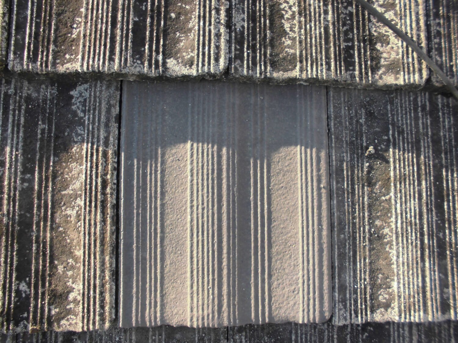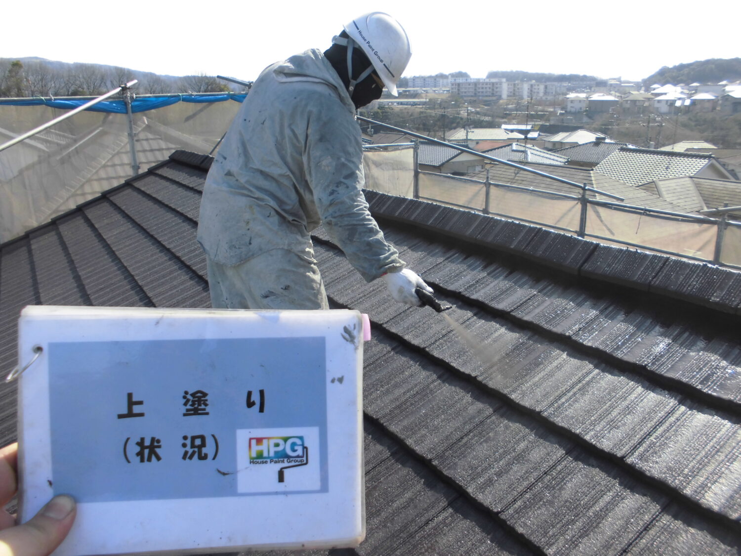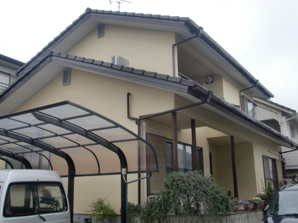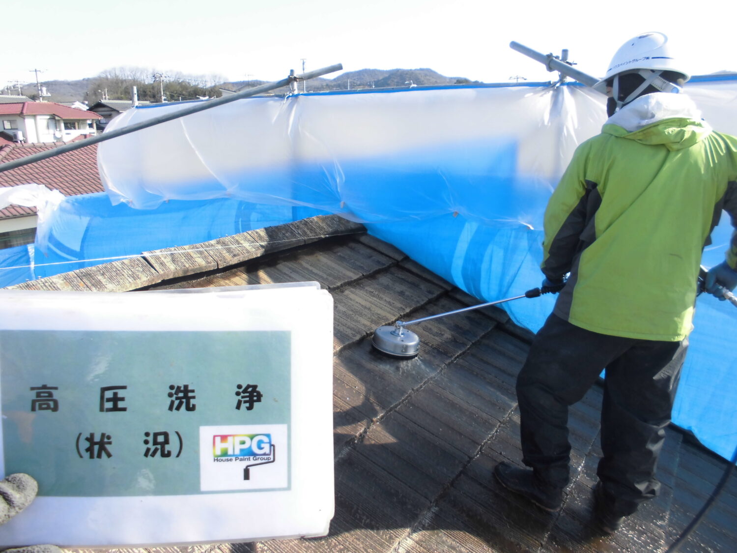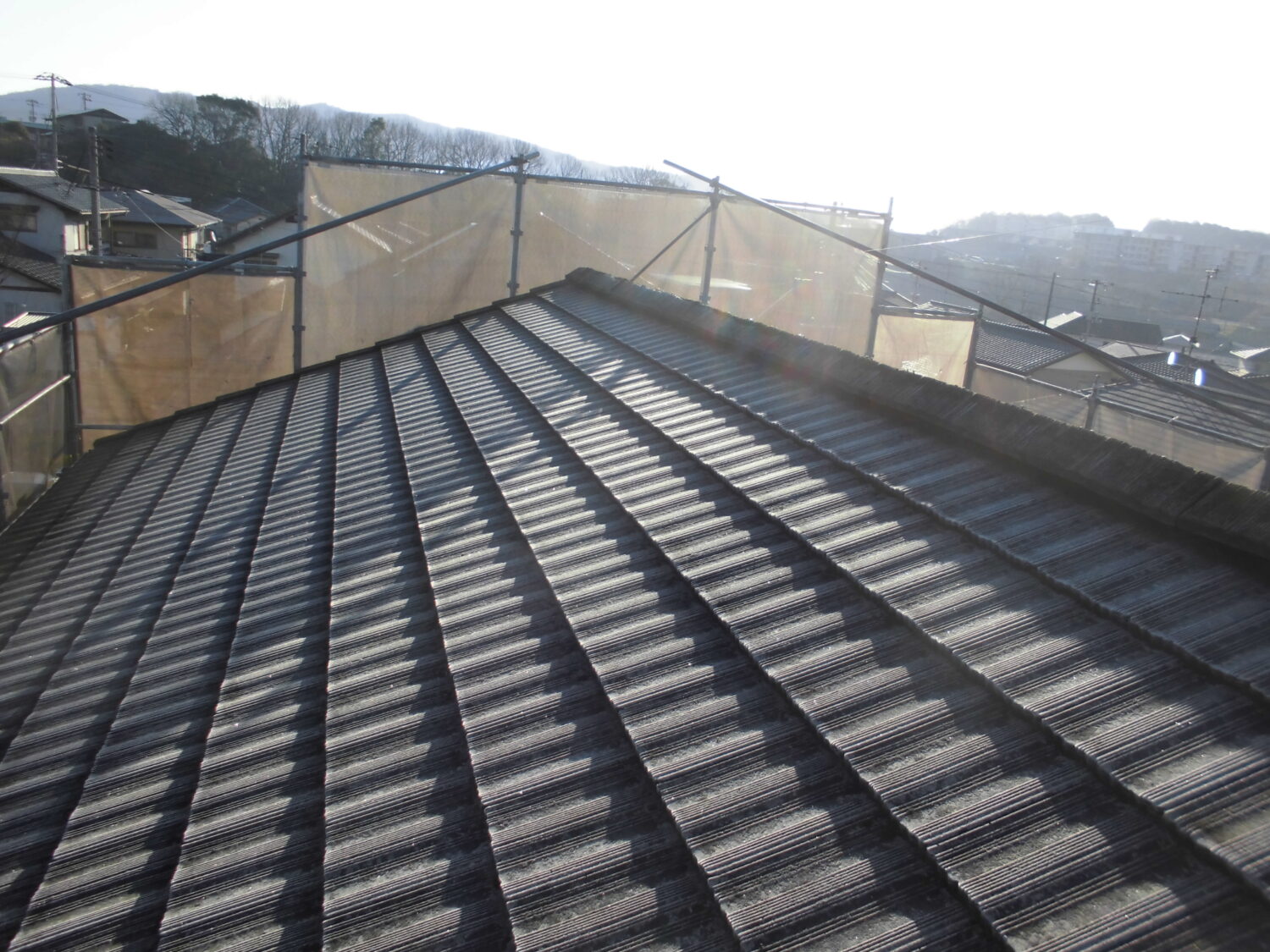 【施工前】 【施工後】 瓦がひび割れています。 新しいものと交換します 高圧洗浄で汚れを落とします。 下塗りの様子 中塗りの様子 上塗りの様子