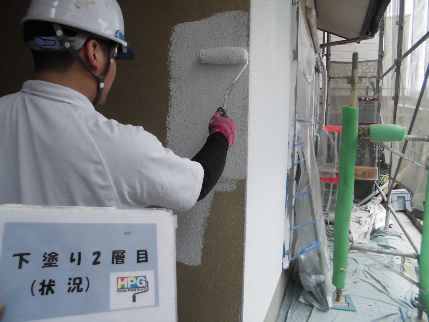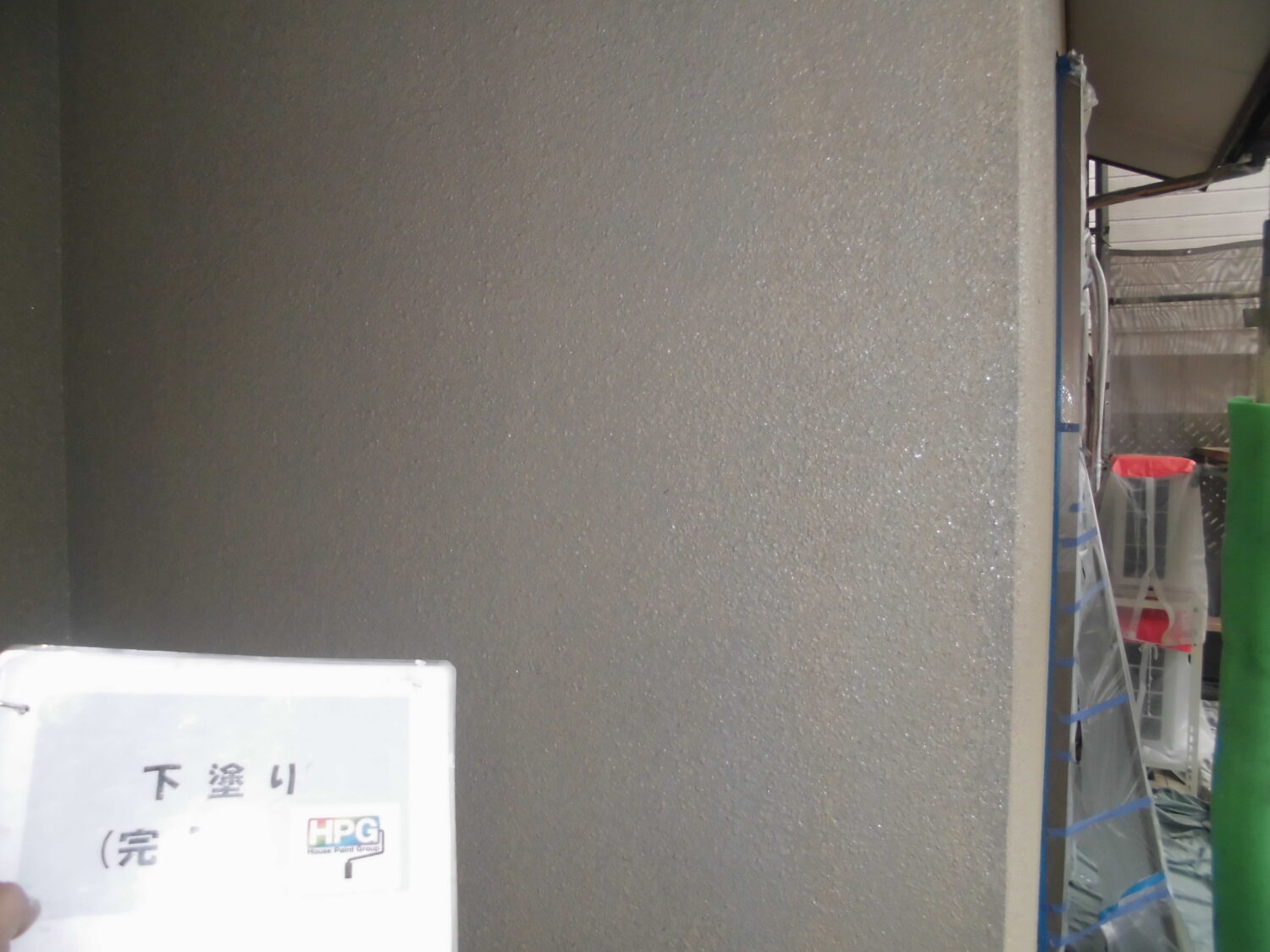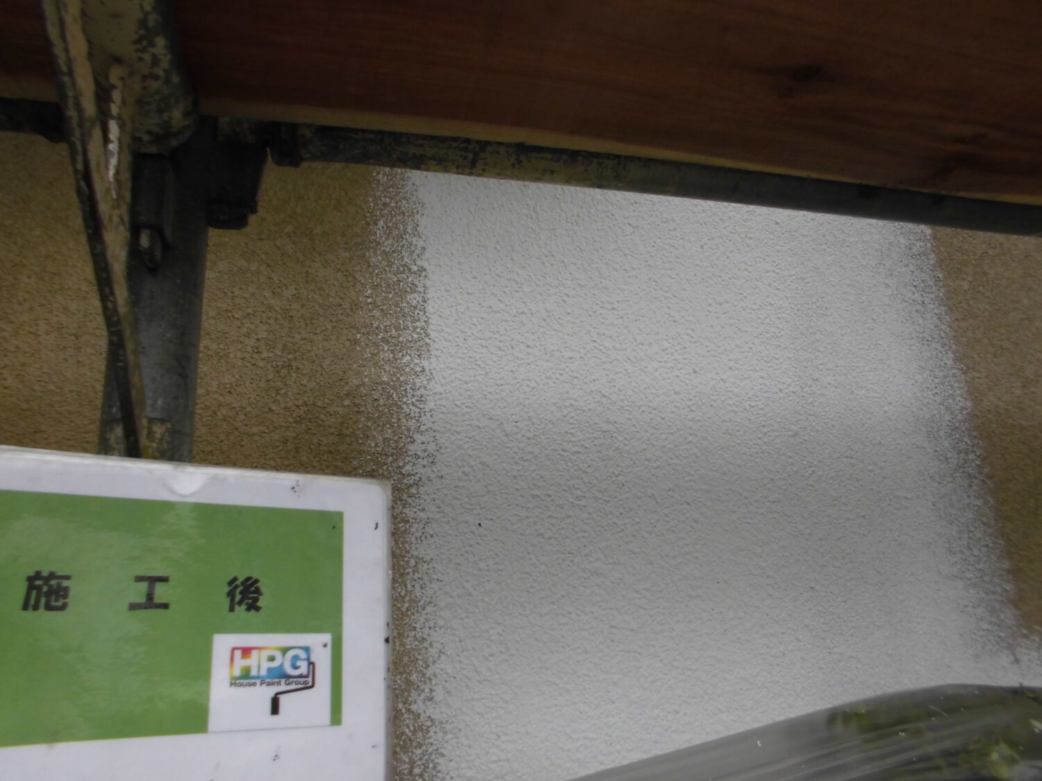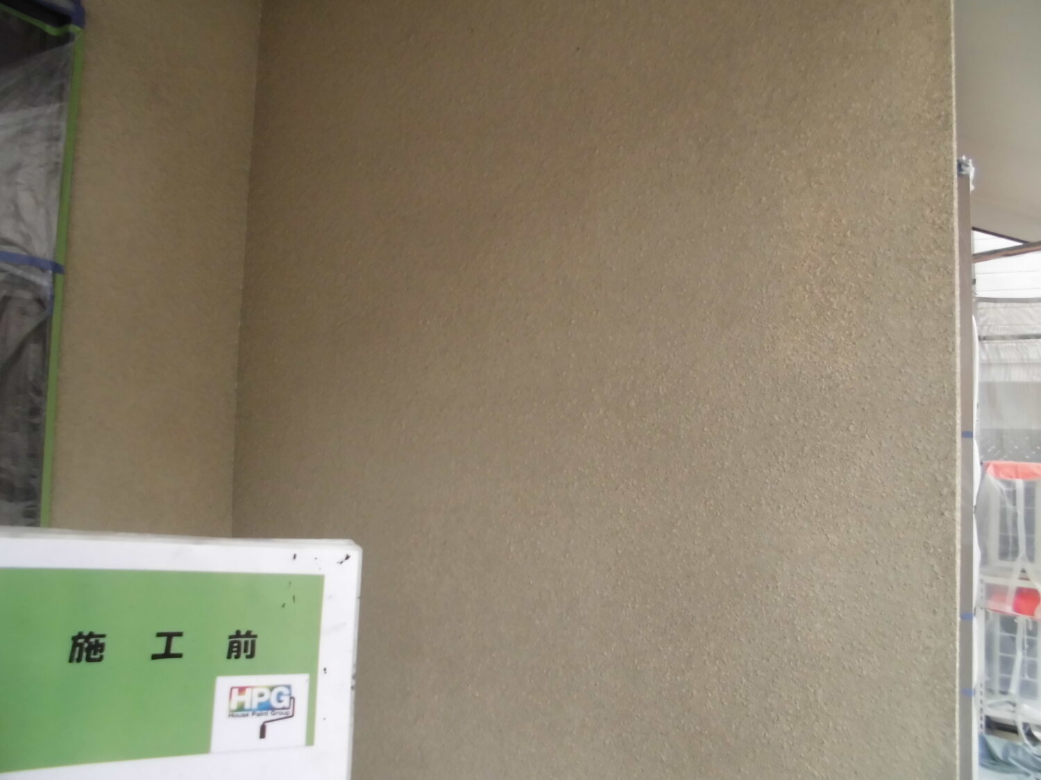【施工前】 【施工後】 ひび割が入っています。 下処理後、シーリング材を充填し 表面を均一に均しました 古い補修痕も 再補修を行い素地を調整します 綺麗に補修出来ていますね 先ずは下塗り1層目です 下塗り1層目完了です 更に下塗りを重ねます 2層の下塗りが完了した状態です 中塗りで色が入ります 更に上塗りで完成です
