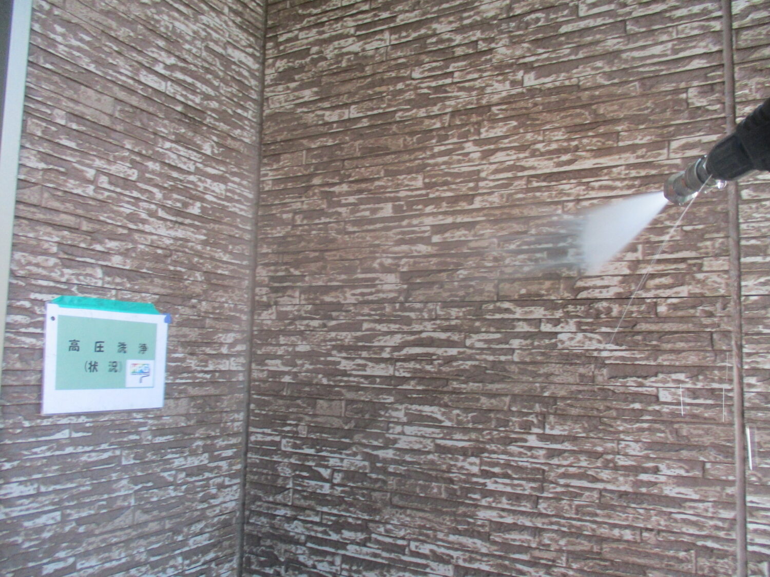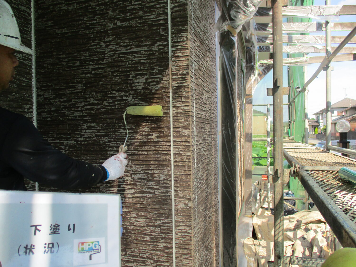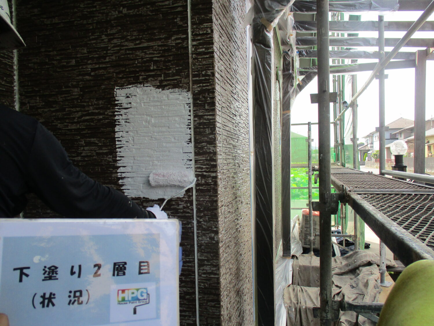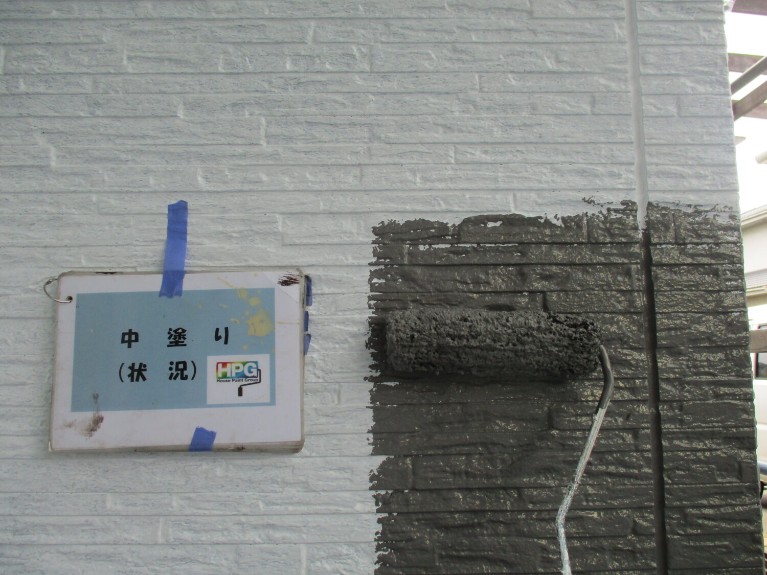 施工前の様子です プライマーを塗布後、 シーリング補修を行います 塗装前にひび割れの補修を行います 高圧洗浄で汚れを落としていきます まずは下塗り1層目です 丁寧に2層の下塗りを行う事で 仕上がりが格段に良くなります 中塗りの様子です さらに上塗りを重ねていきます 丁寧な4回塗りで綺麗に仕上がっています