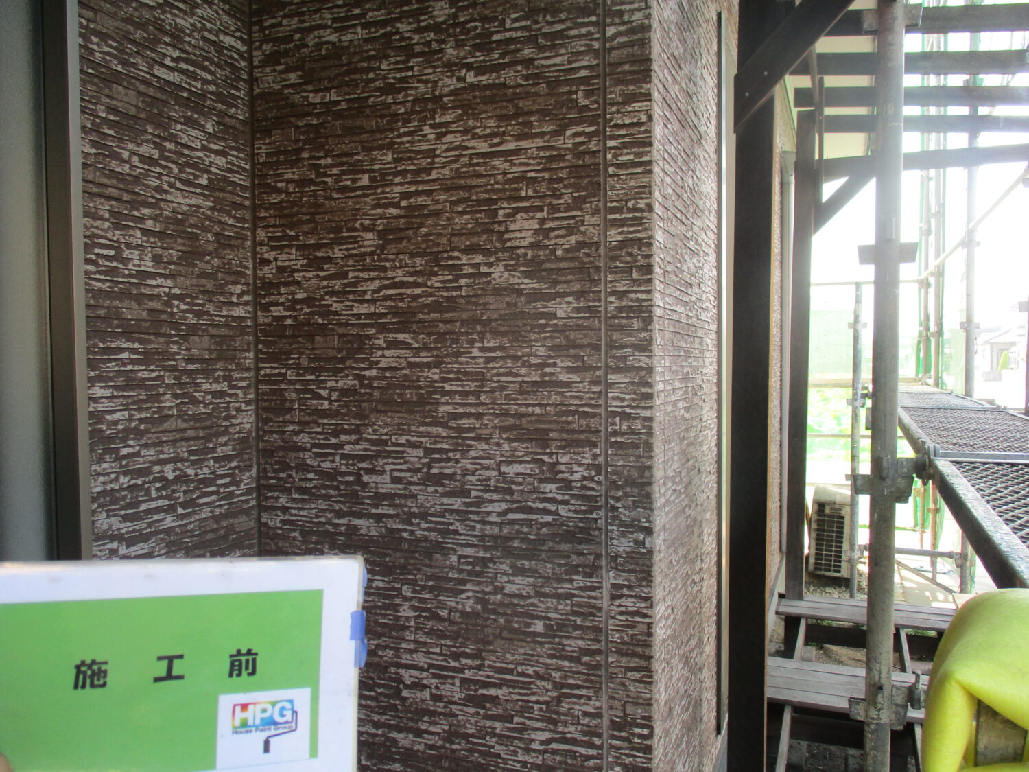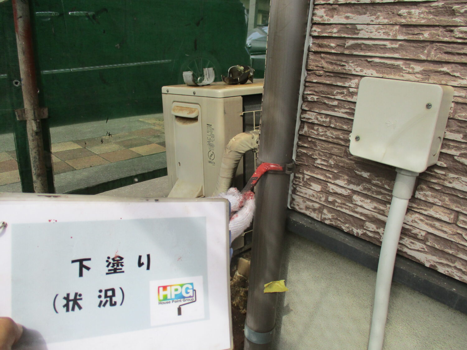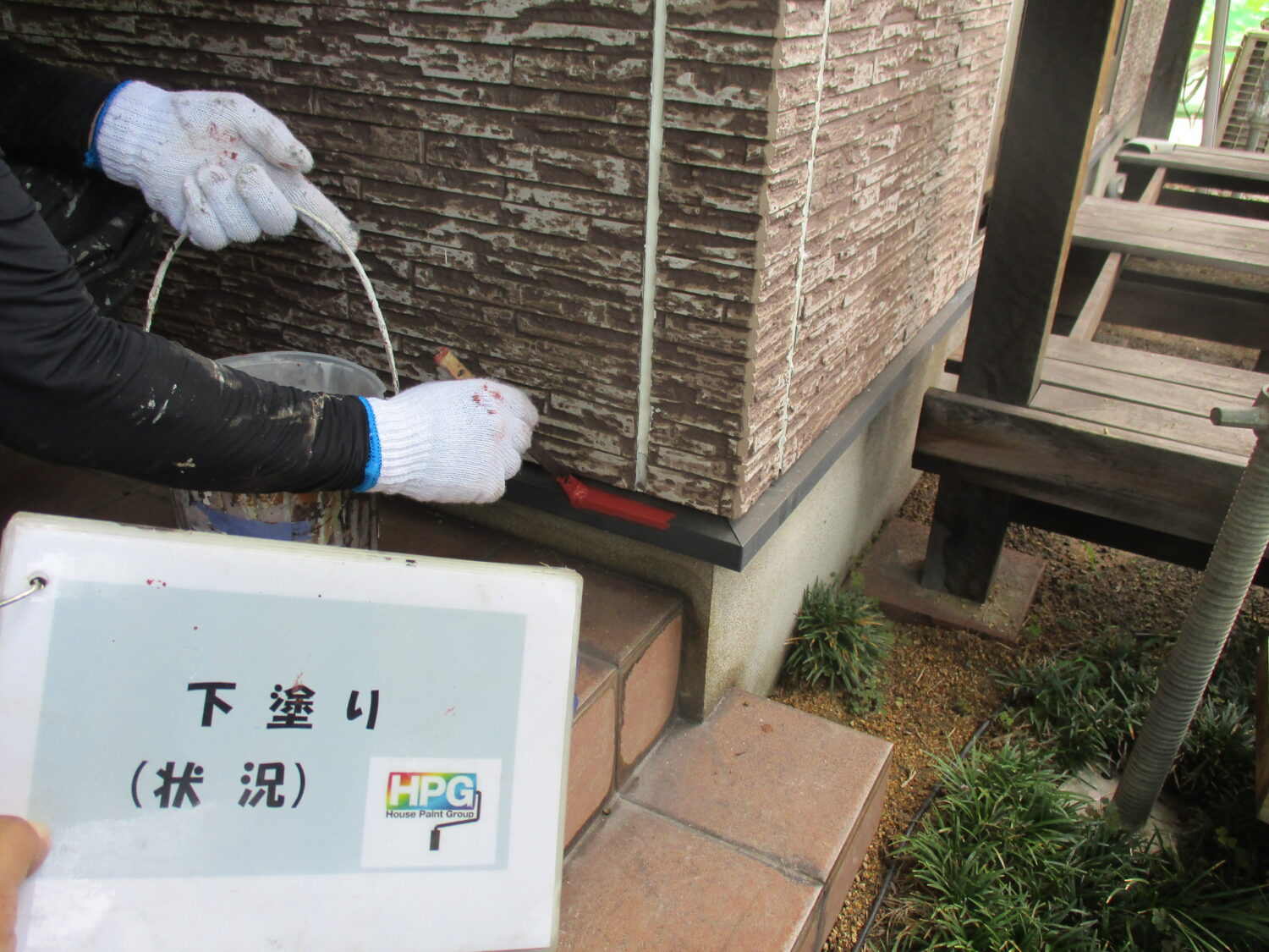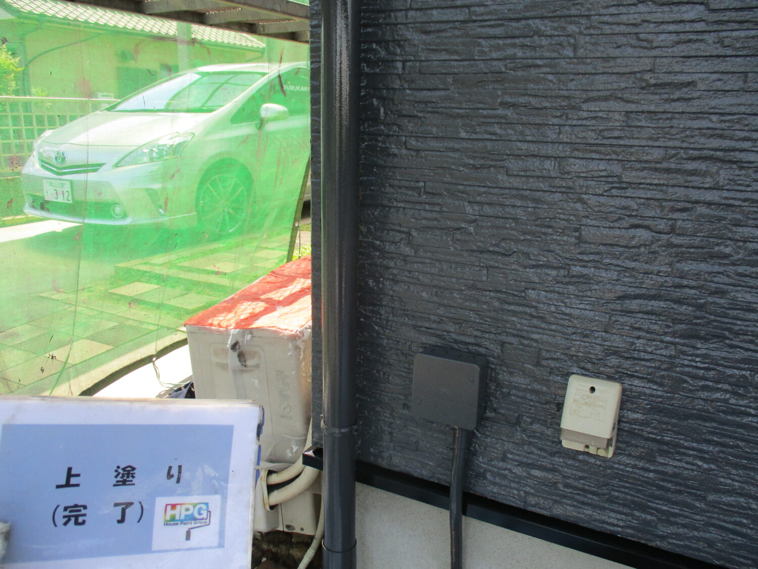 施工前の様子です プライマーを塗布後、 シーリング補修を行います 塗装前にひび割れの補修を行います 高圧洗浄で汚れを落としていきます まずは下塗り1層目です 丁寧に2層の下塗りを行う事で 仕上がりが格段に良くなります 中塗りの様子です さらに上塗りを重ねていきます 丁寧な4回塗りで綺麗に仕上がっています