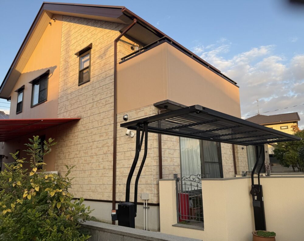 施工箇所:屋根・外壁・付帯(破風・鼻隠し・軒天・樋・出窓上部・勝手口庇・窓上小庇・基礎上水切り・ベランダ笠木・ベランダ水切り・ウッドデッキ・門柱・外塀)