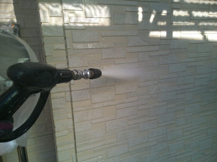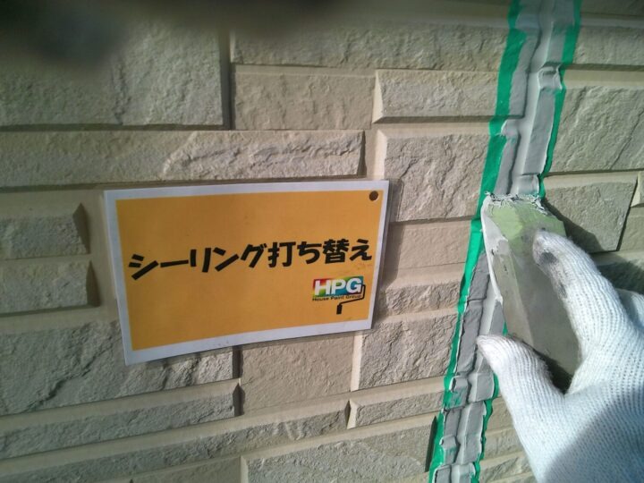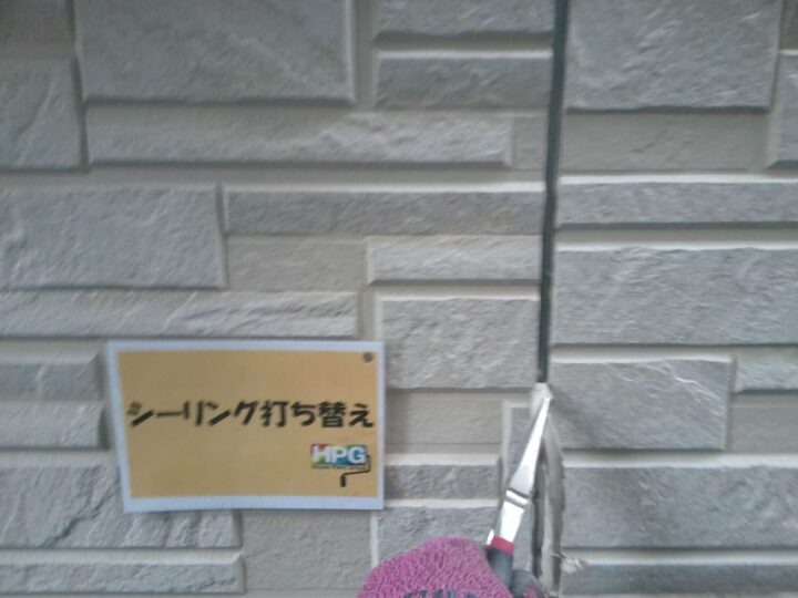 外壁塗装工事では、高圧洗浄で汚れをしっかり除去し、シーリングは既存のものを撤去後、新しく打ち替えを実施。
