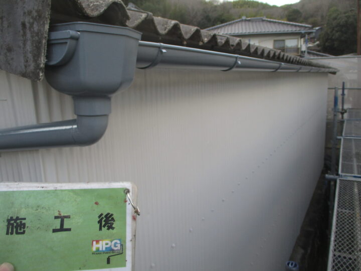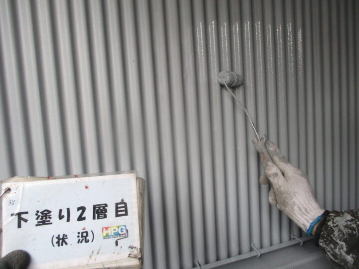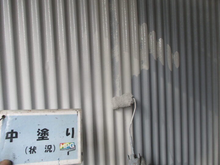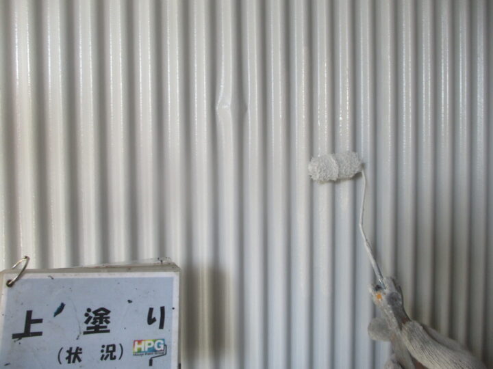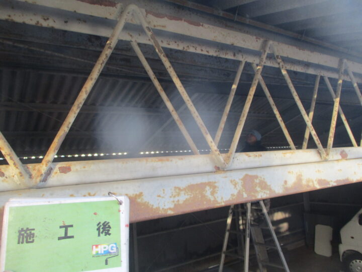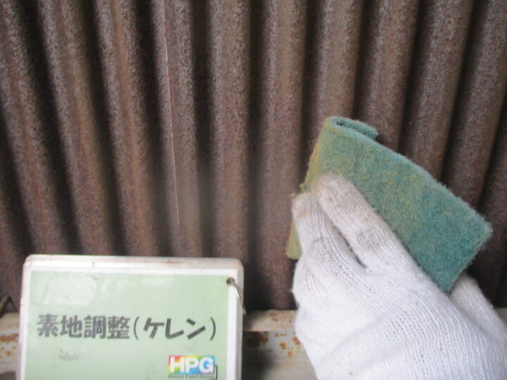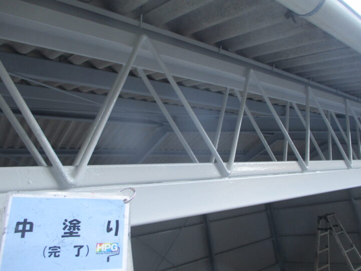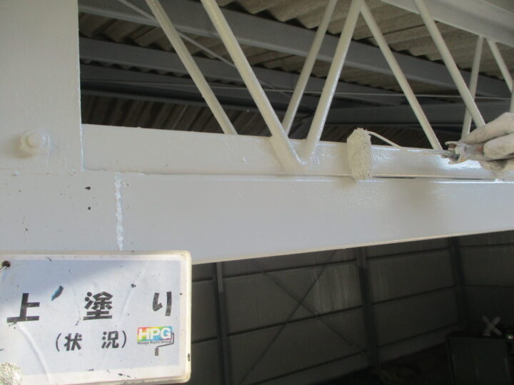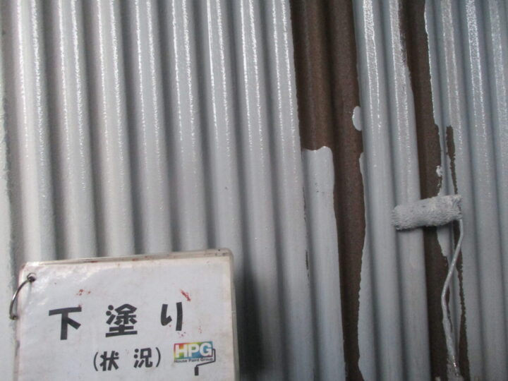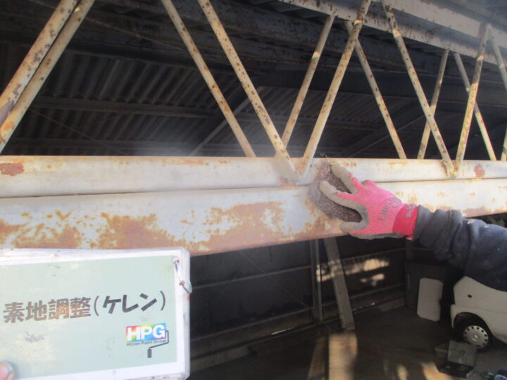 特に重視したのが素地調整です。錆を落とさずに塗装を行うと、数年で再び塗膜が浮いたり剥がれたりする恐れがあります。今回は、波トタン・鉄骨ともに丁寧なケレン作業(素地調整)を行い、錆や旧塗膜を可能な限り除去しました。この下準備こそが、塗装の耐久性を大きく左右する重要な工程です。