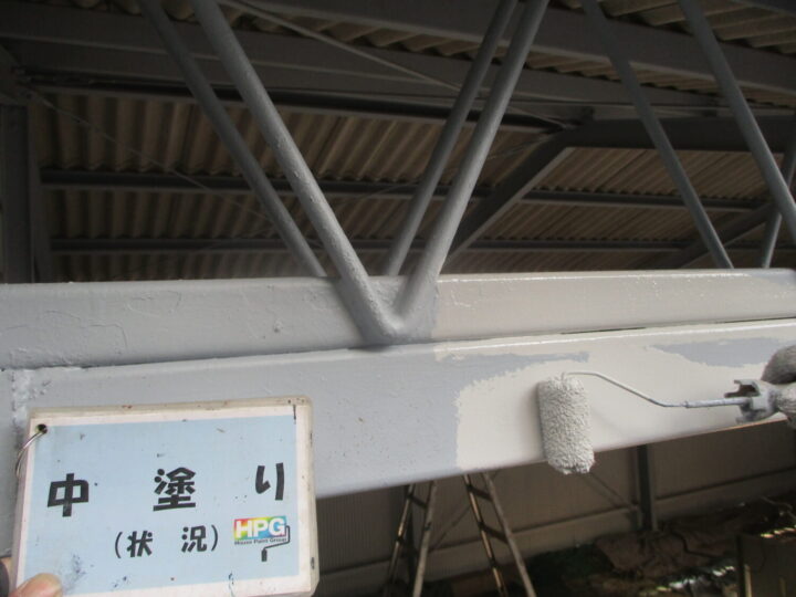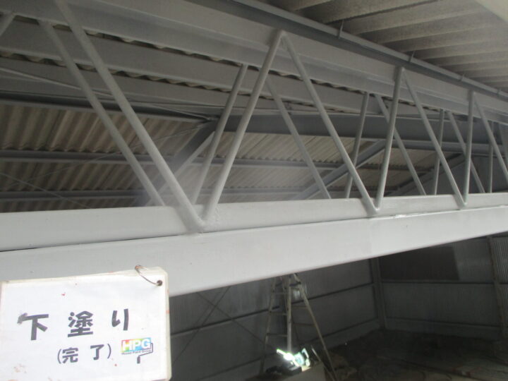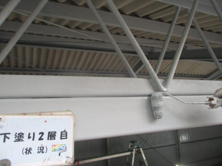 下塗り工程では、防錆性能を高めるために下塗りを2層施工しています。鉄部塗装は、塗り重ねる回数や工程管理によって仕上がりに大きな差が出ます。塗料の性能を最大限に発揮させるため、乾燥時間をしっかり確保しながら、中塗り・上塗りへと進めました。