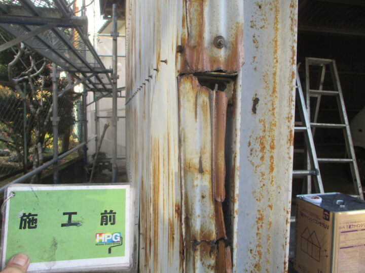 今回の工事では、車庫の波トタンおよび鉄骨部分に広範囲の錆が見られました。鉄部は一度錆が発生すると、塗膜の下で進行してしまうケースも多く、見た目以上に劣化が進んでいることがあります。そのため、見た目をきれいにするだけの塗装ではなく、「今後どれだけ長く安心して使っていただけるか」を最優先に考えた施工計画を立てました。