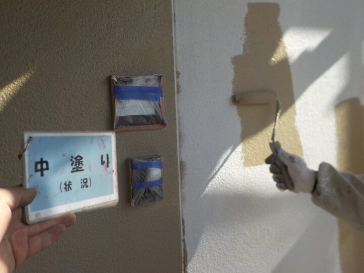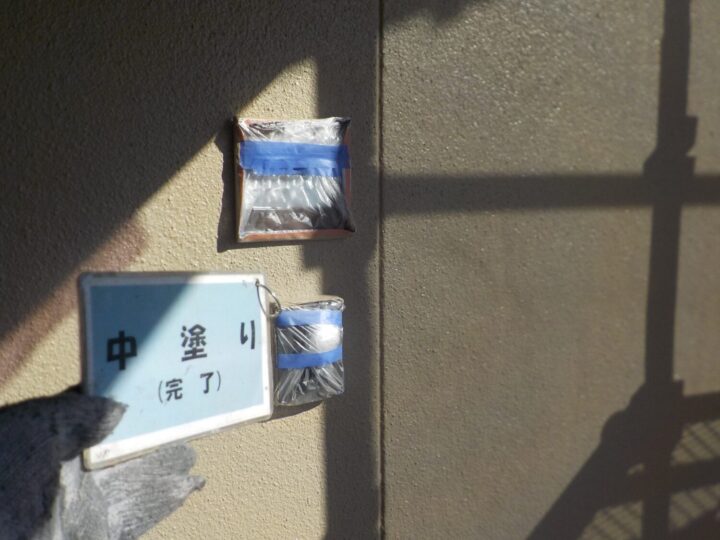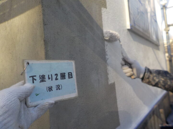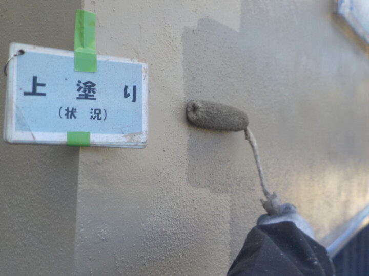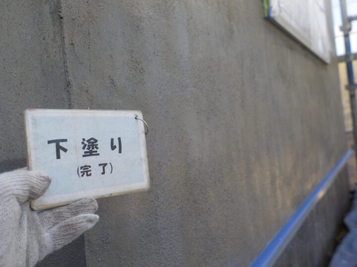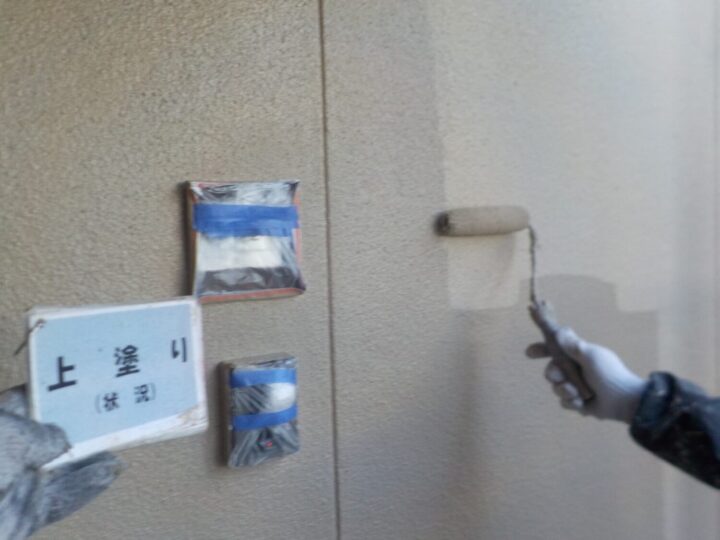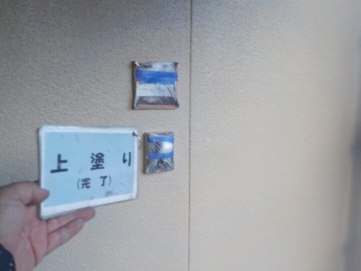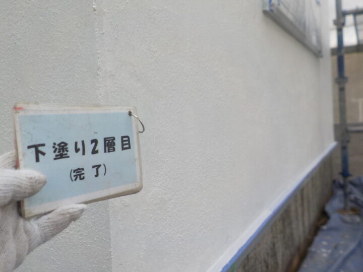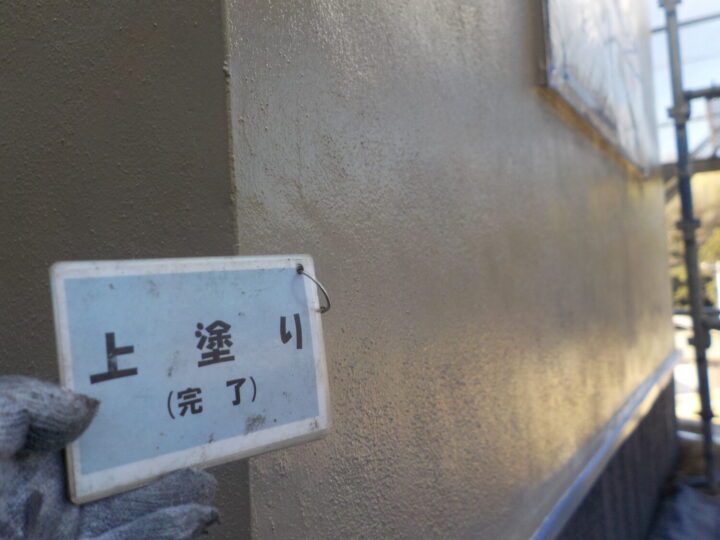 塗装工程では、下塗りを2回行い、塗膜の厚みと耐久性を確保しています。中塗り・上塗りには日本ペイントのパーフェクトトップを使用し、外壁全体はND-184、東面のアクセント部分にはND-375を採用しました。色分けを行うことで、建物全体に立体感とアクセントが生まれ、落ち着きのある上品な仕上がりになったと感じております。
